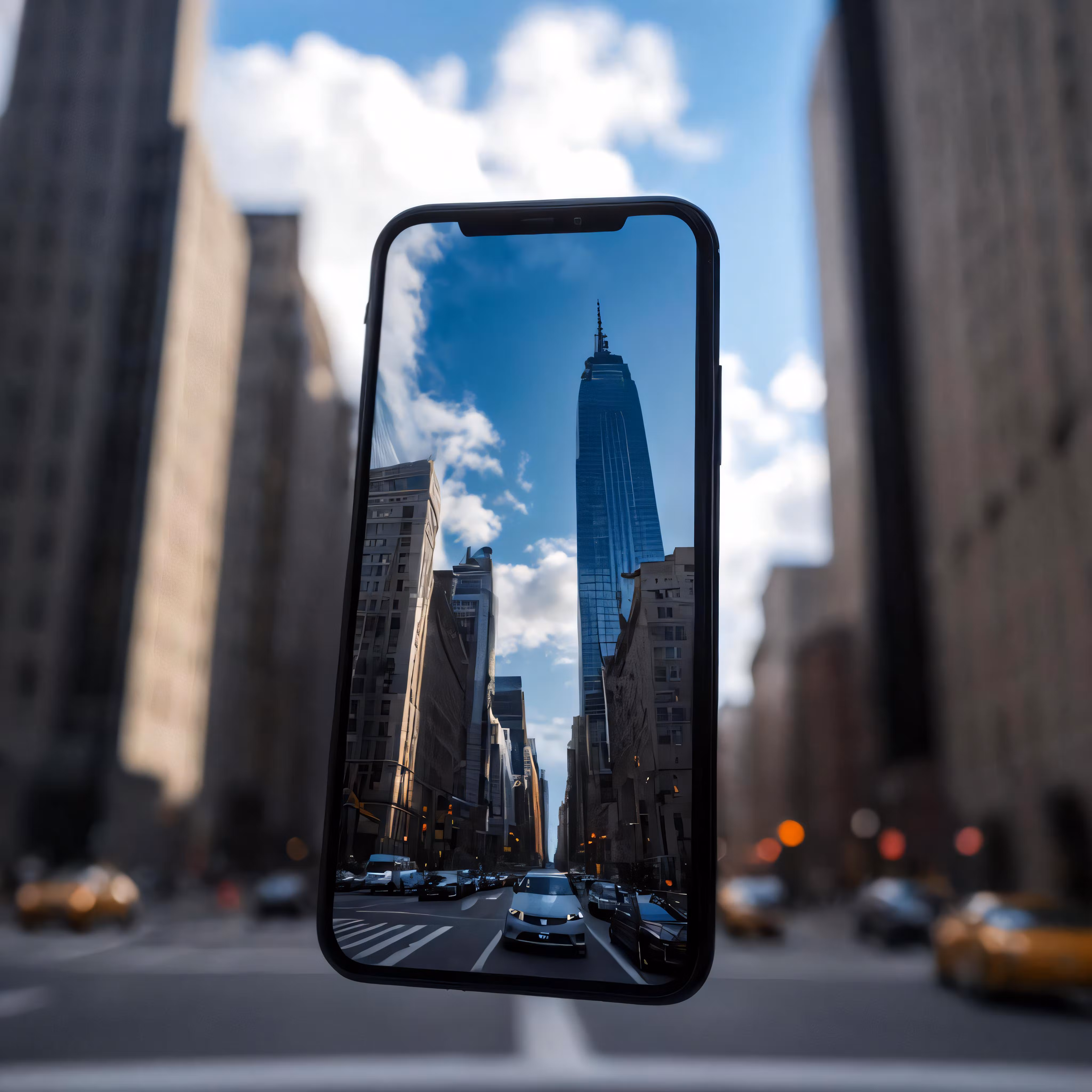 High resolution picture, free to use, a side view mirror with a picture of a skyscraper