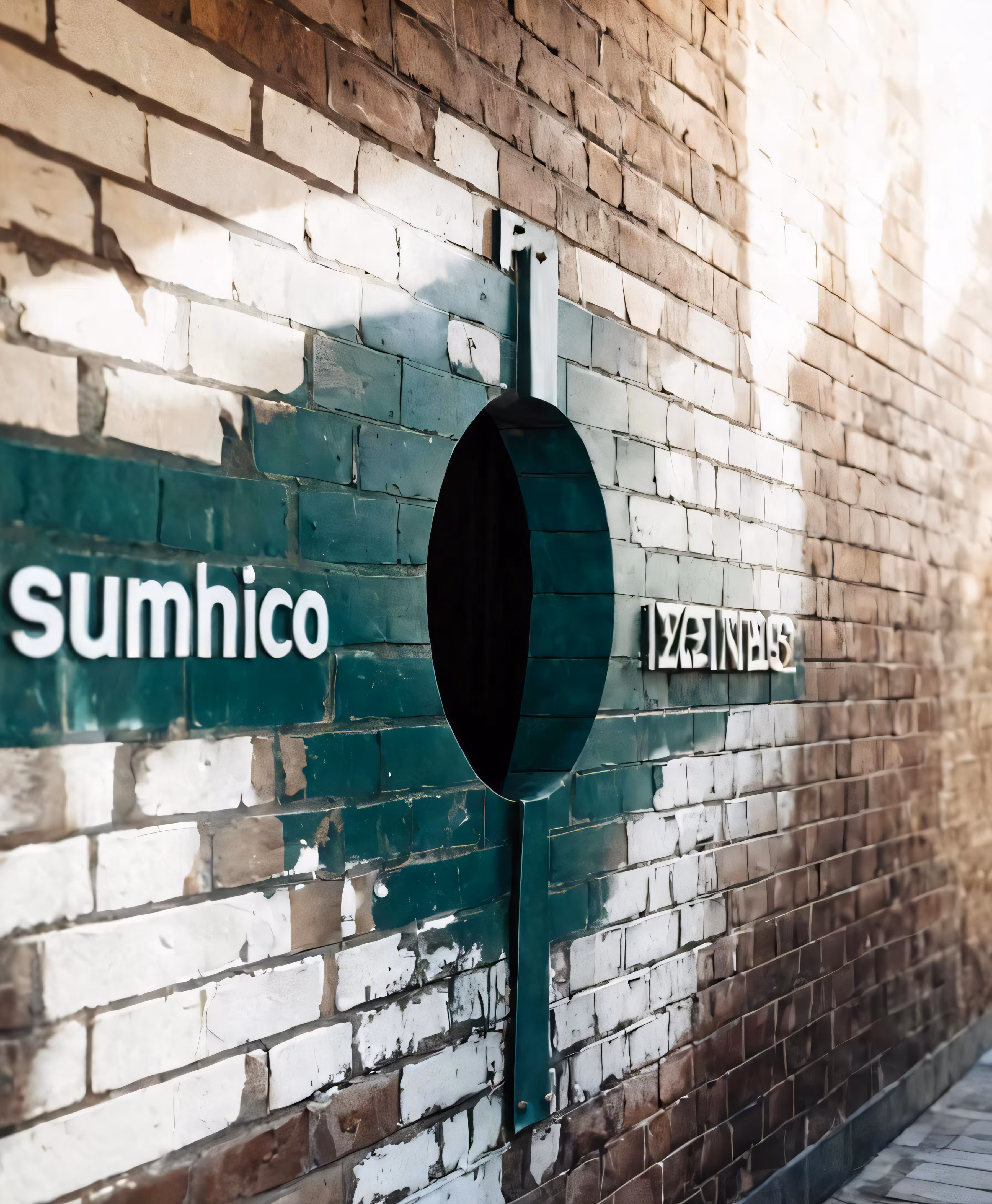 High resolution picture, free to use, a sign mounted to the side of a brick wall that says summico