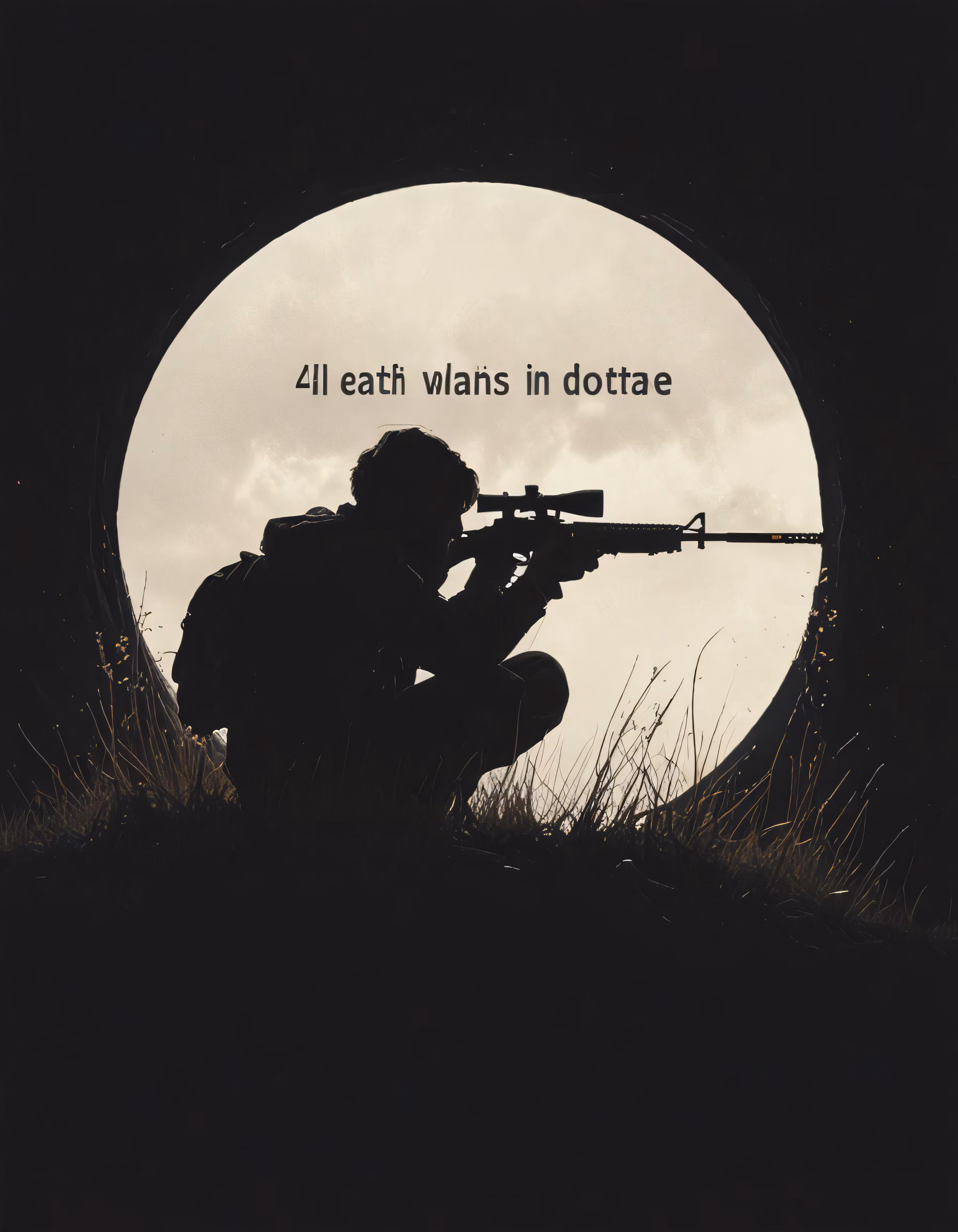 High resolution picture, free to use, a silhouetted person with a rifle crouching near a moon