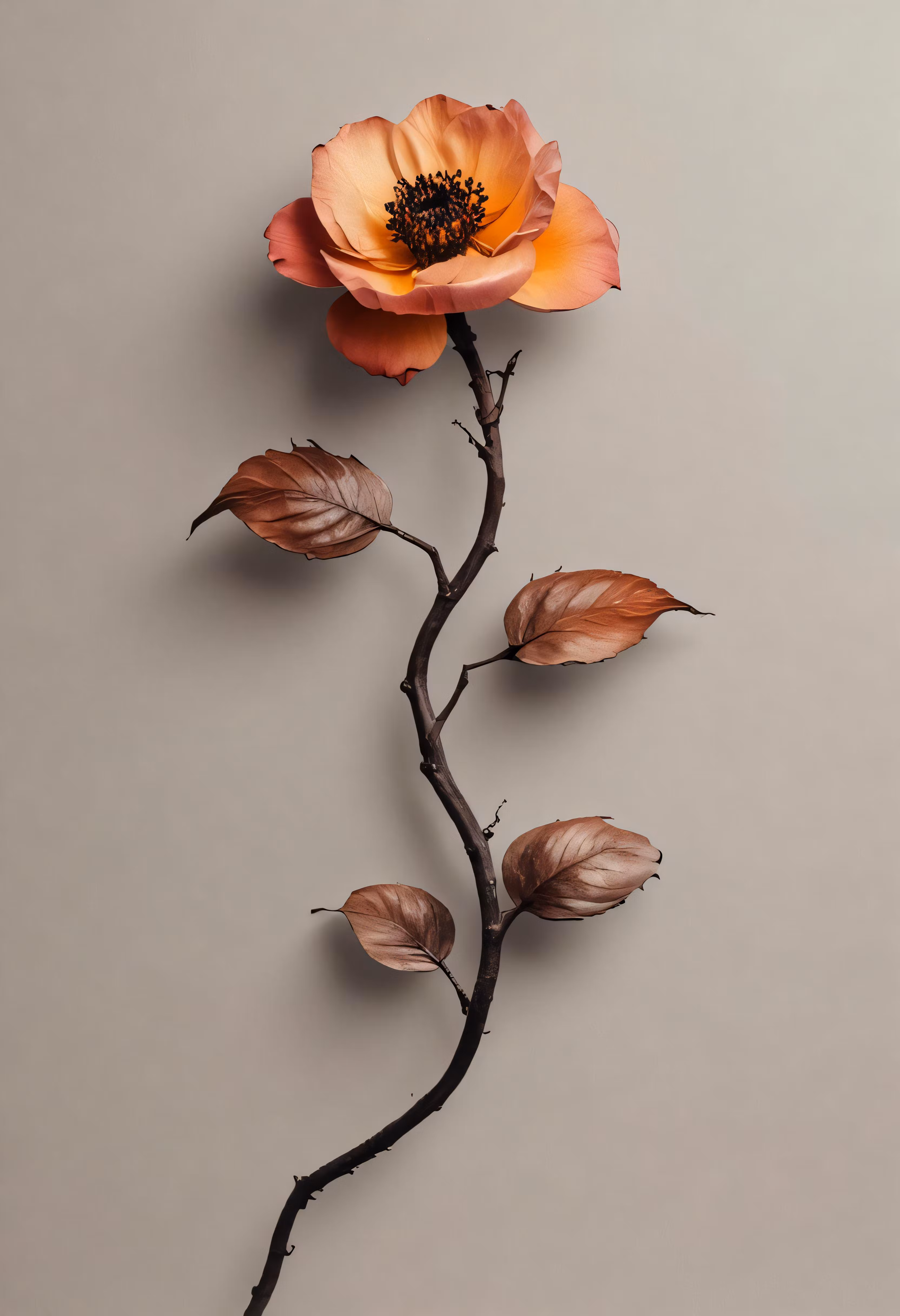 High resolution picture, free to use, a single peach colored flower with leaves against a gray background