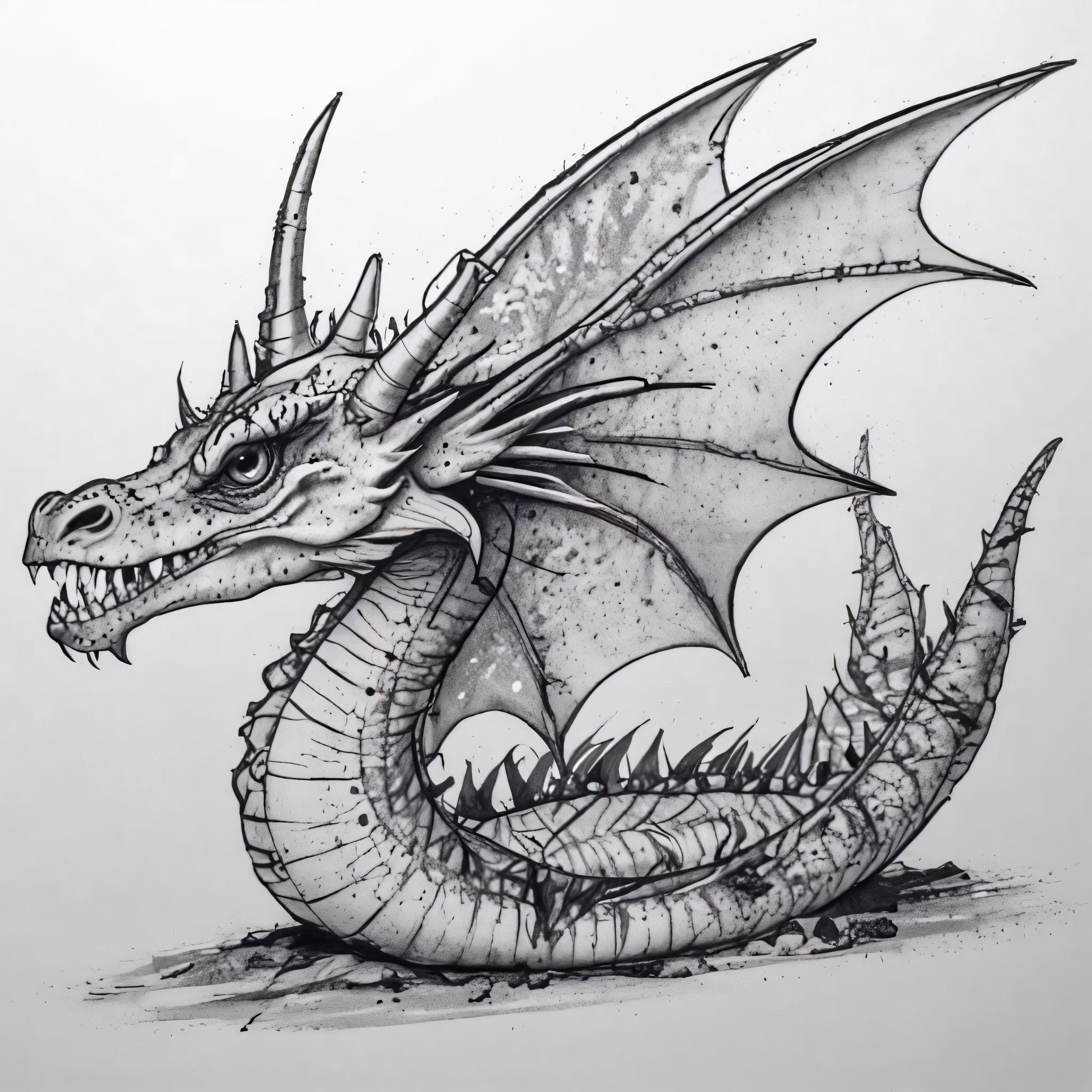 High resolution picture, free to use, a sketch of a dragon sitting on the ground