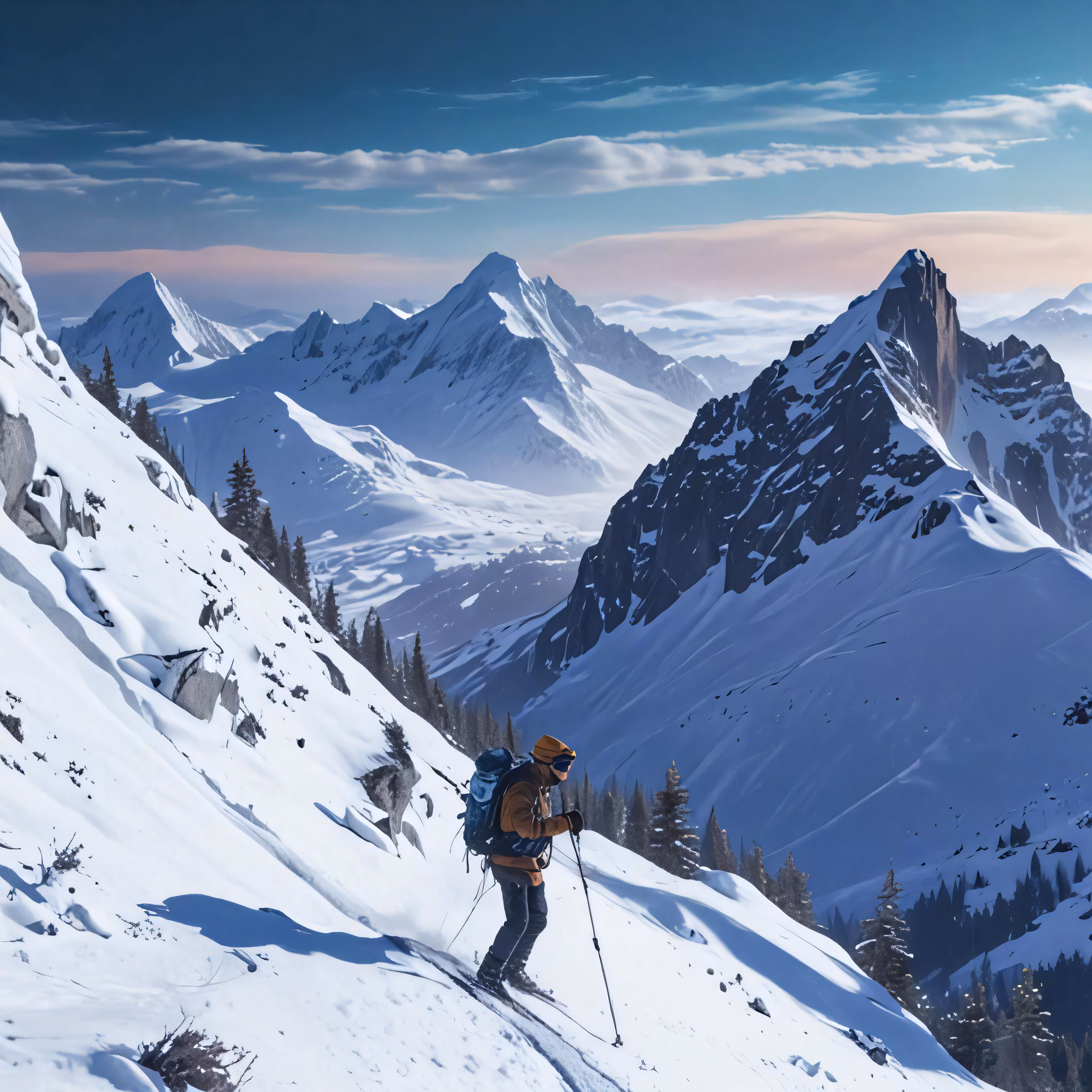 High resolution picture, free to use, a skier stands on the side of a snowy mountain with tall mountains in the background