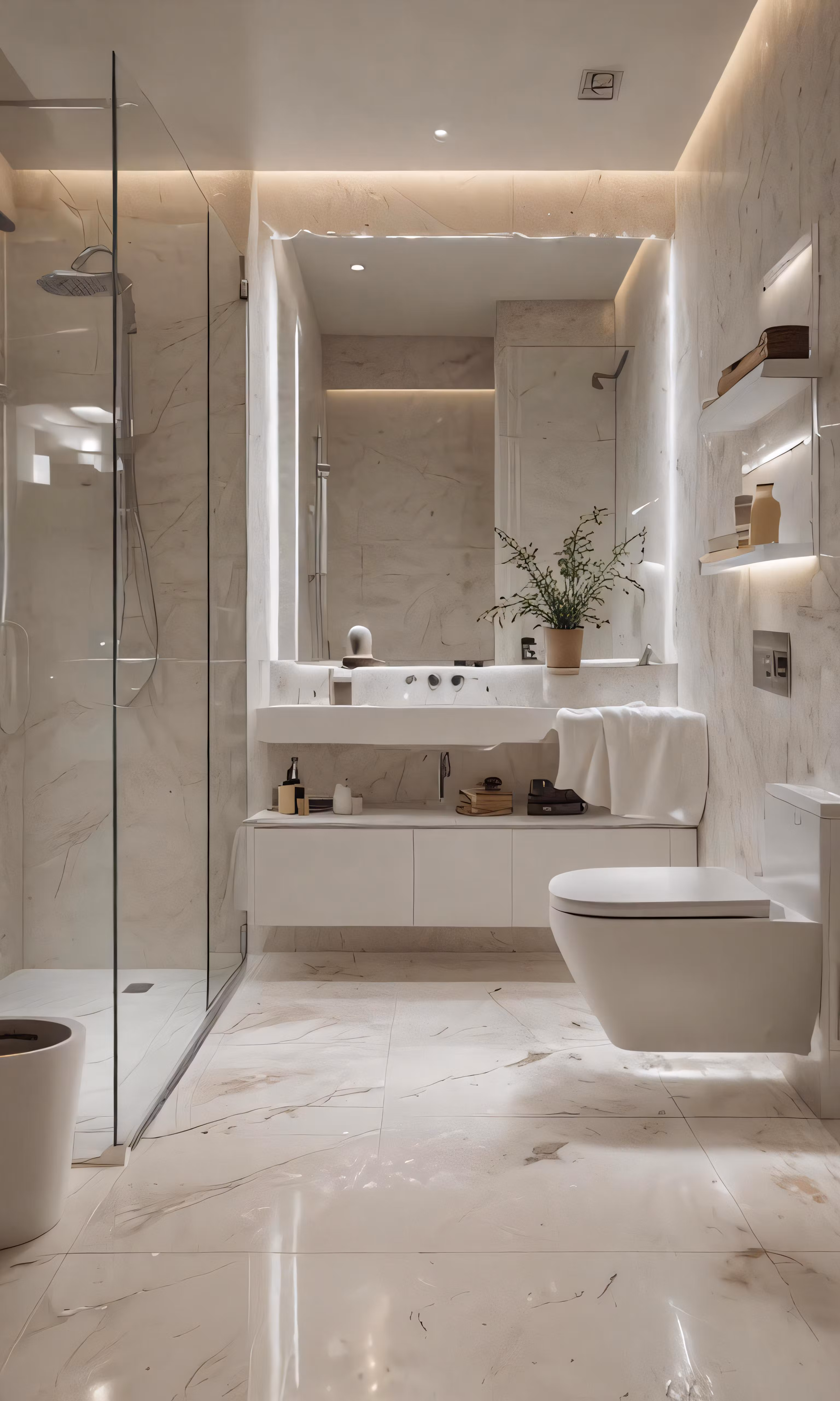 High resolution picture, free to use, a sleek white bathroom with a glass partition