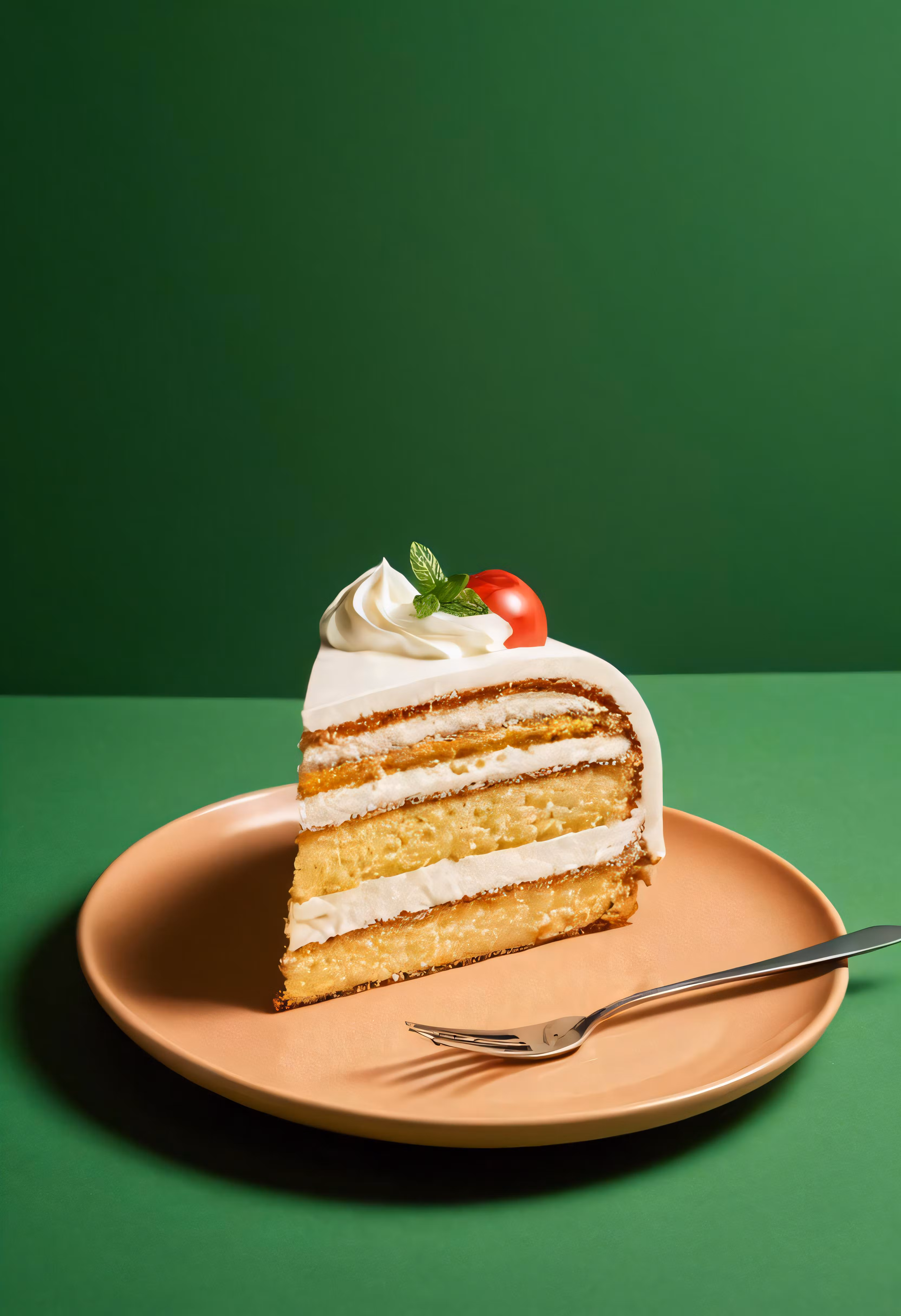 High resolution picture, free to use, a slice of cake on a plate, with a fork in the foreground