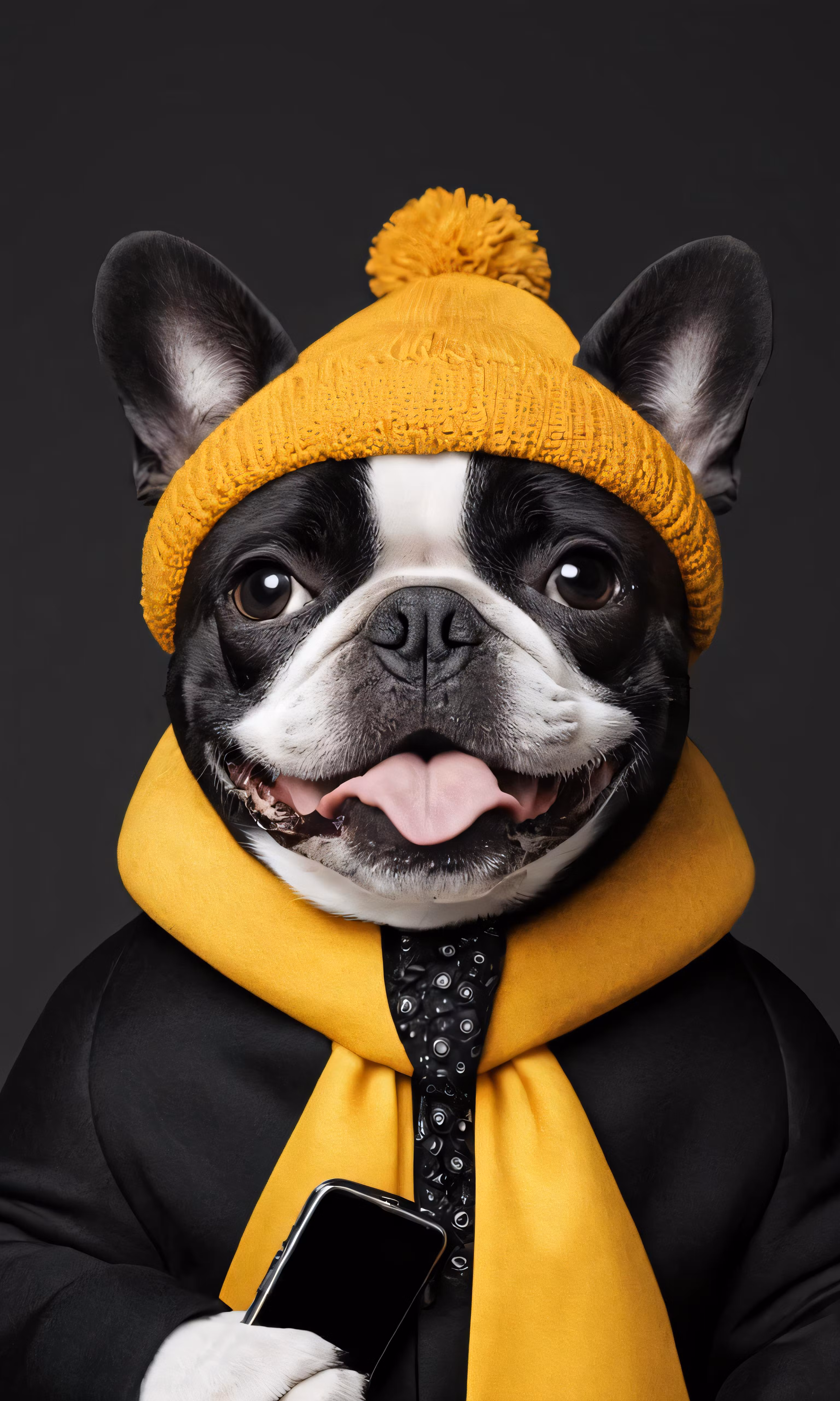 High resolution picture, free to use, a small black and white dog in yellow scarf, hat, and sweater
