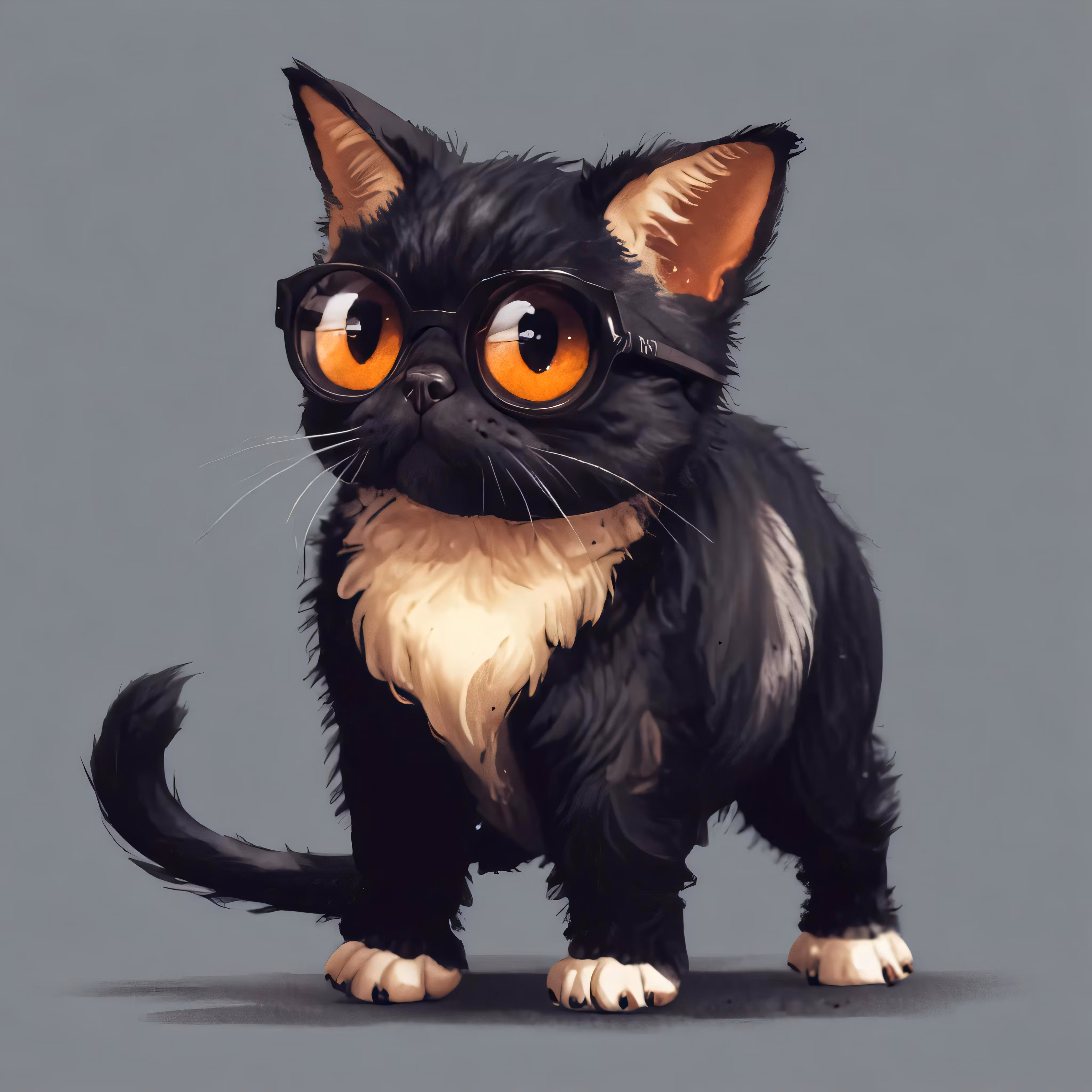 High resolution picture, free to use, a small black cat with yellow eyes, with white paws and black fur