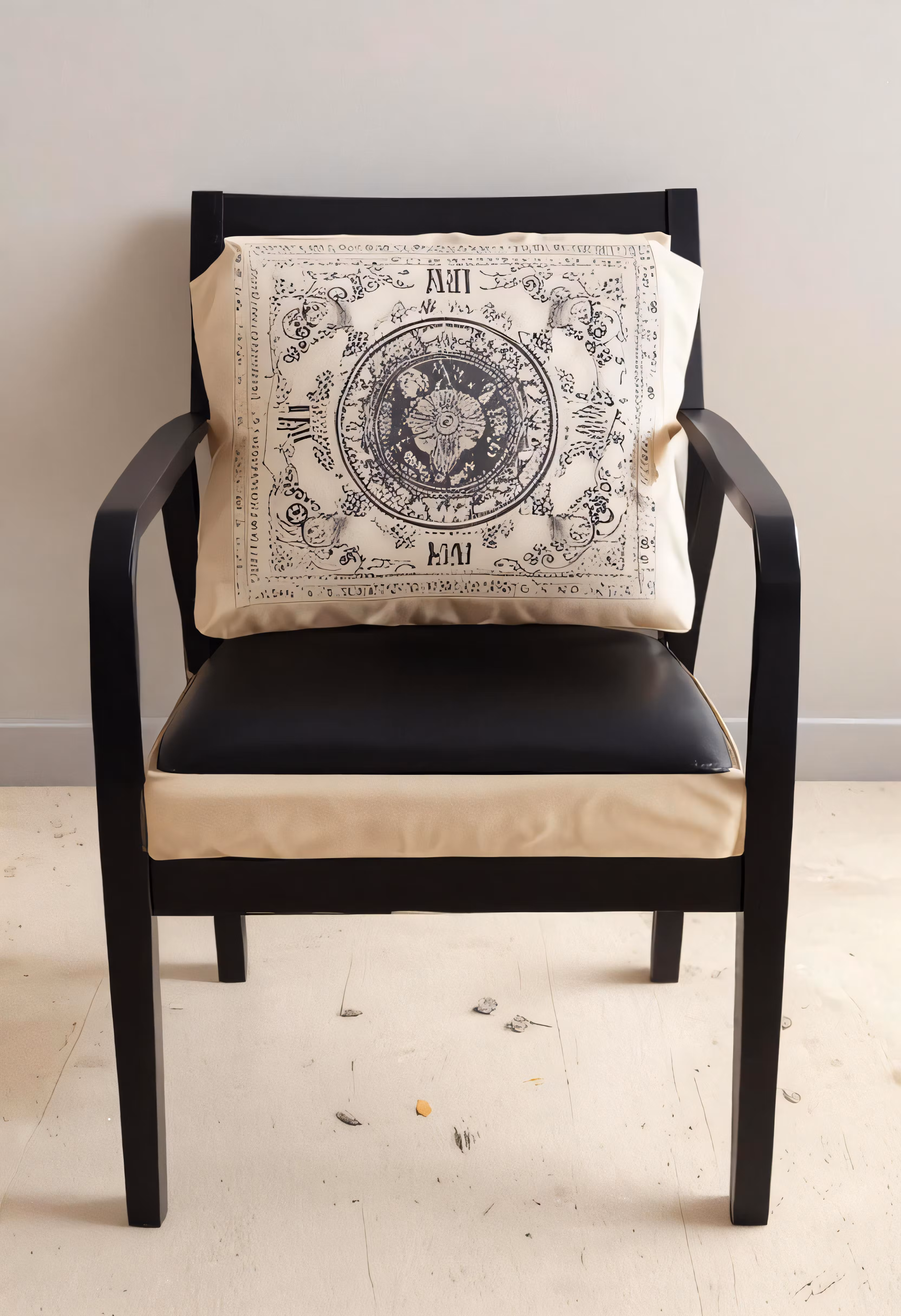 High resolution picture, free to use, a small black chair has a pillow with a chinese motif on it
