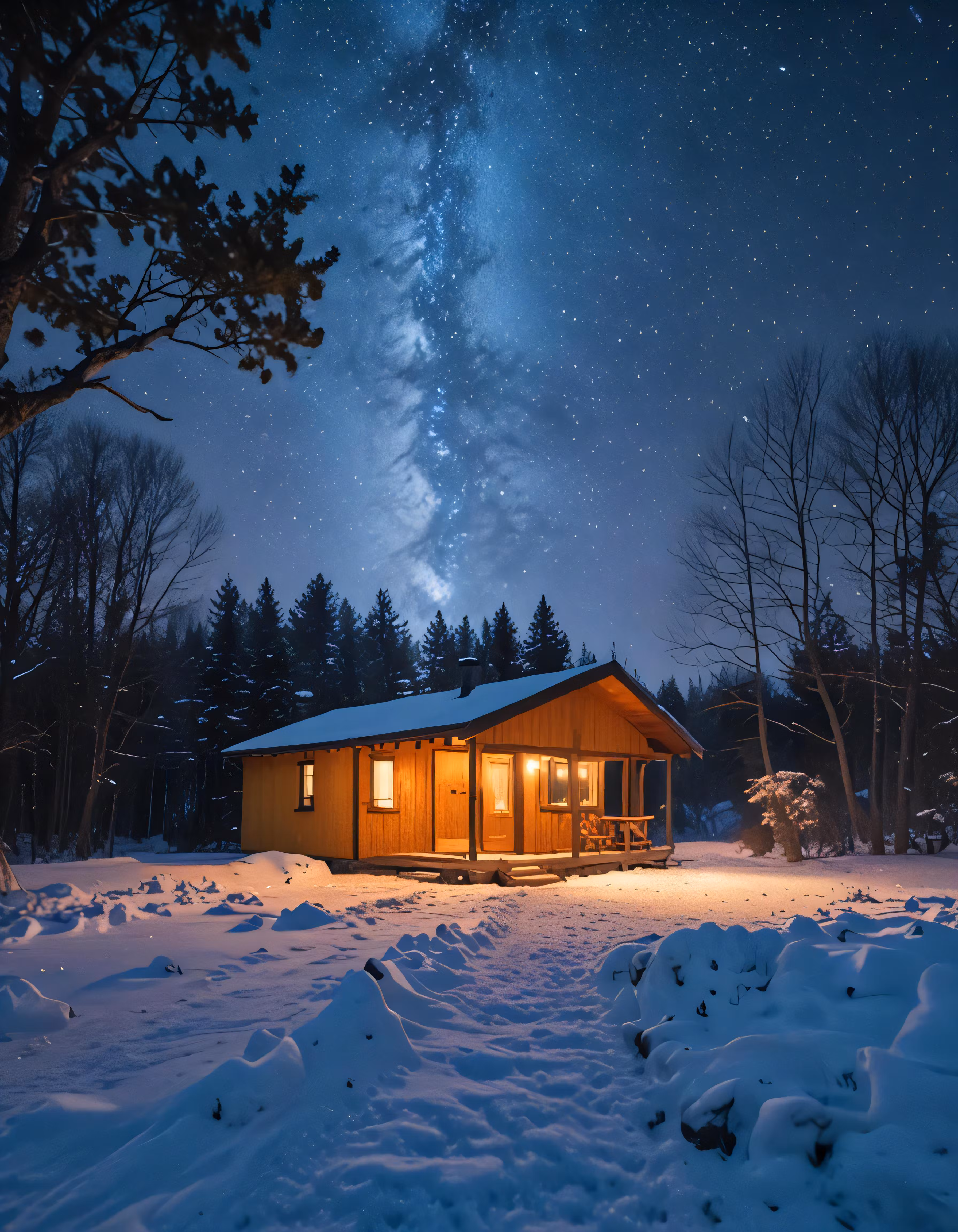 High resolution picture, free to use, a small cabin sitting on top of snow covered ground under a night sky filled with stars