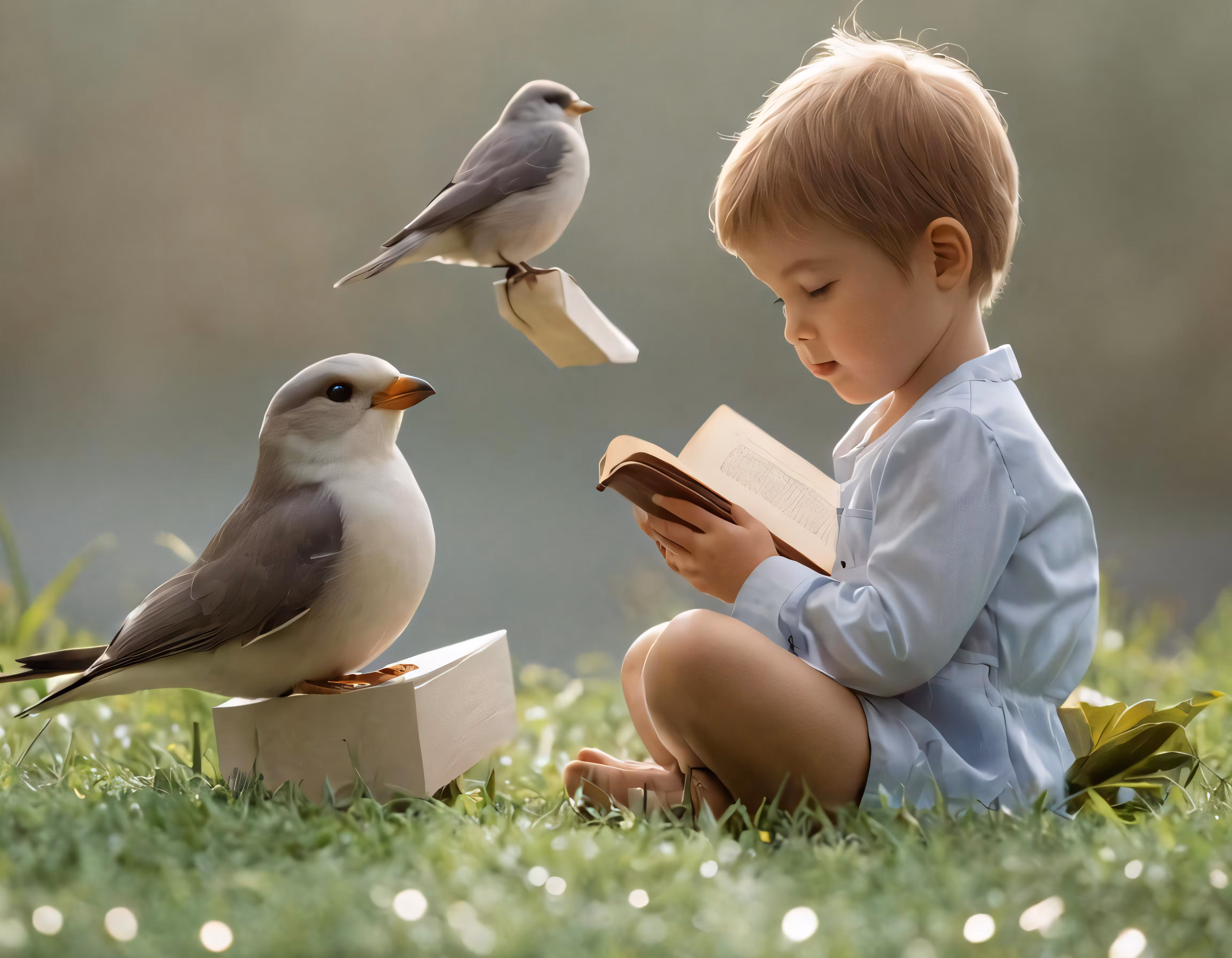 High resolution picture, free to use, a small child sitting on the ground reading a book next to a bird