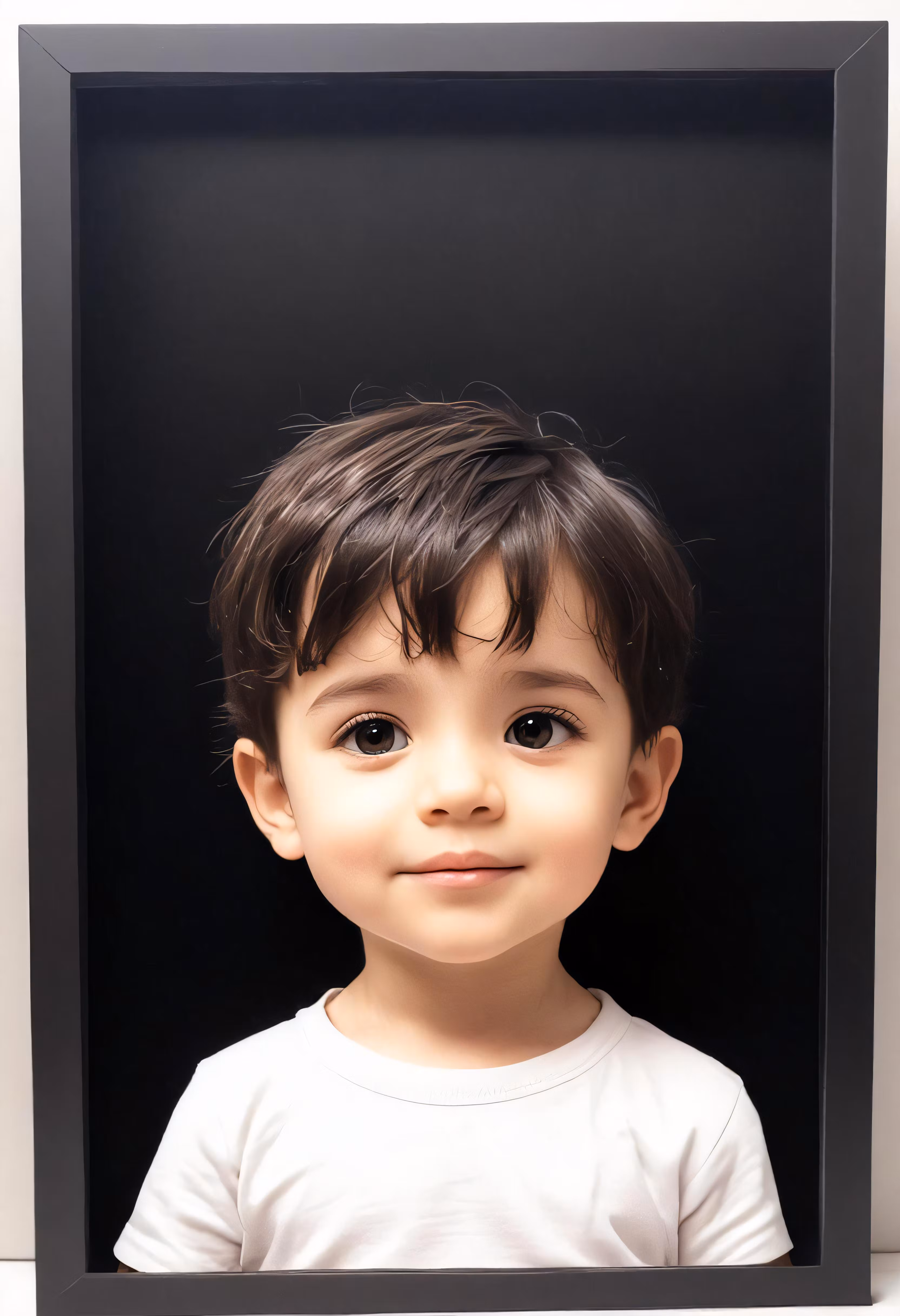 High resolution picture, free to use, a small child with dark brown hair posing in a black frame