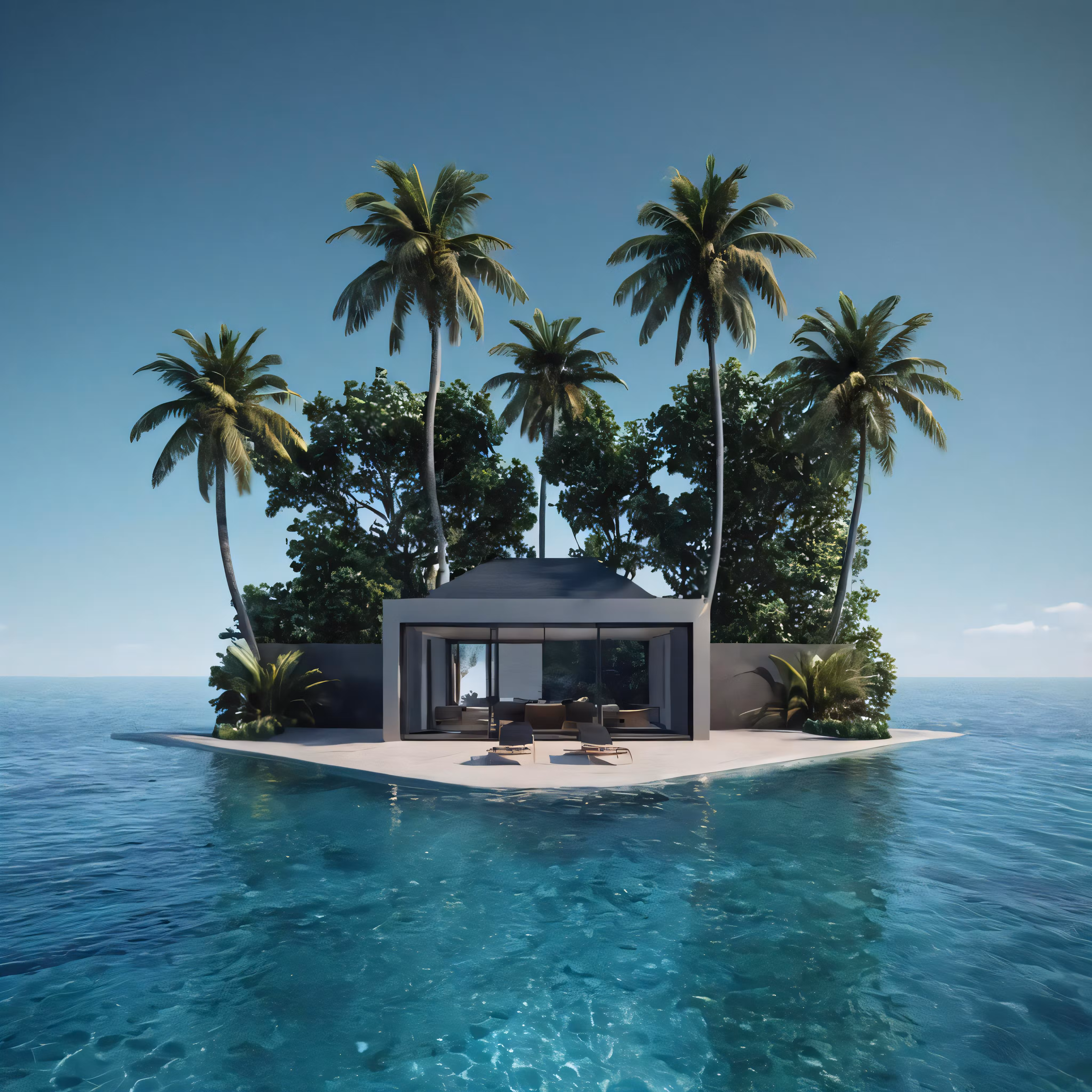 High resolution picture, free to use, a small cottage with two chairs on an island in the middle of the ocean