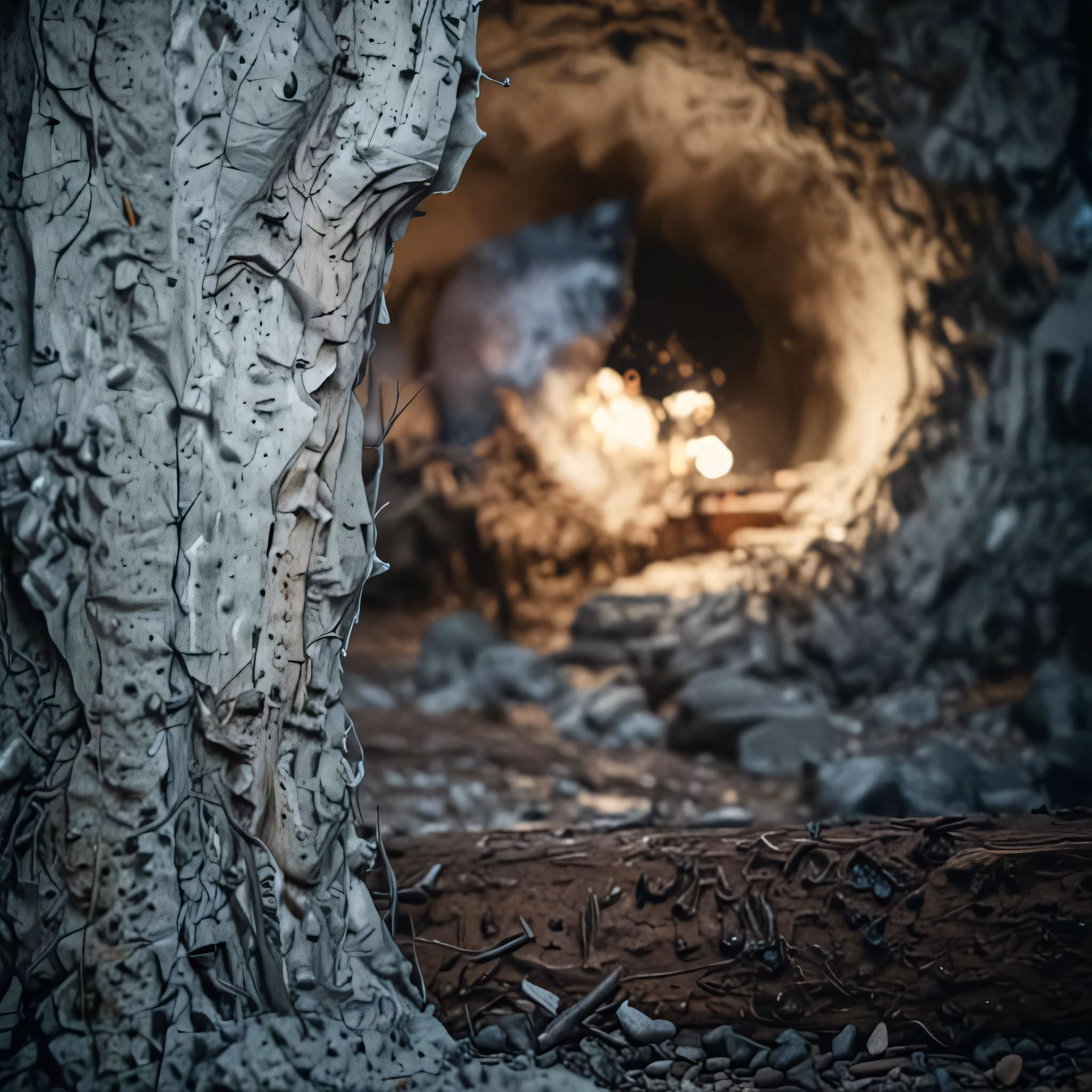 High resolution picture, free to use, a small dark tunnel with lots of rocks on the ground