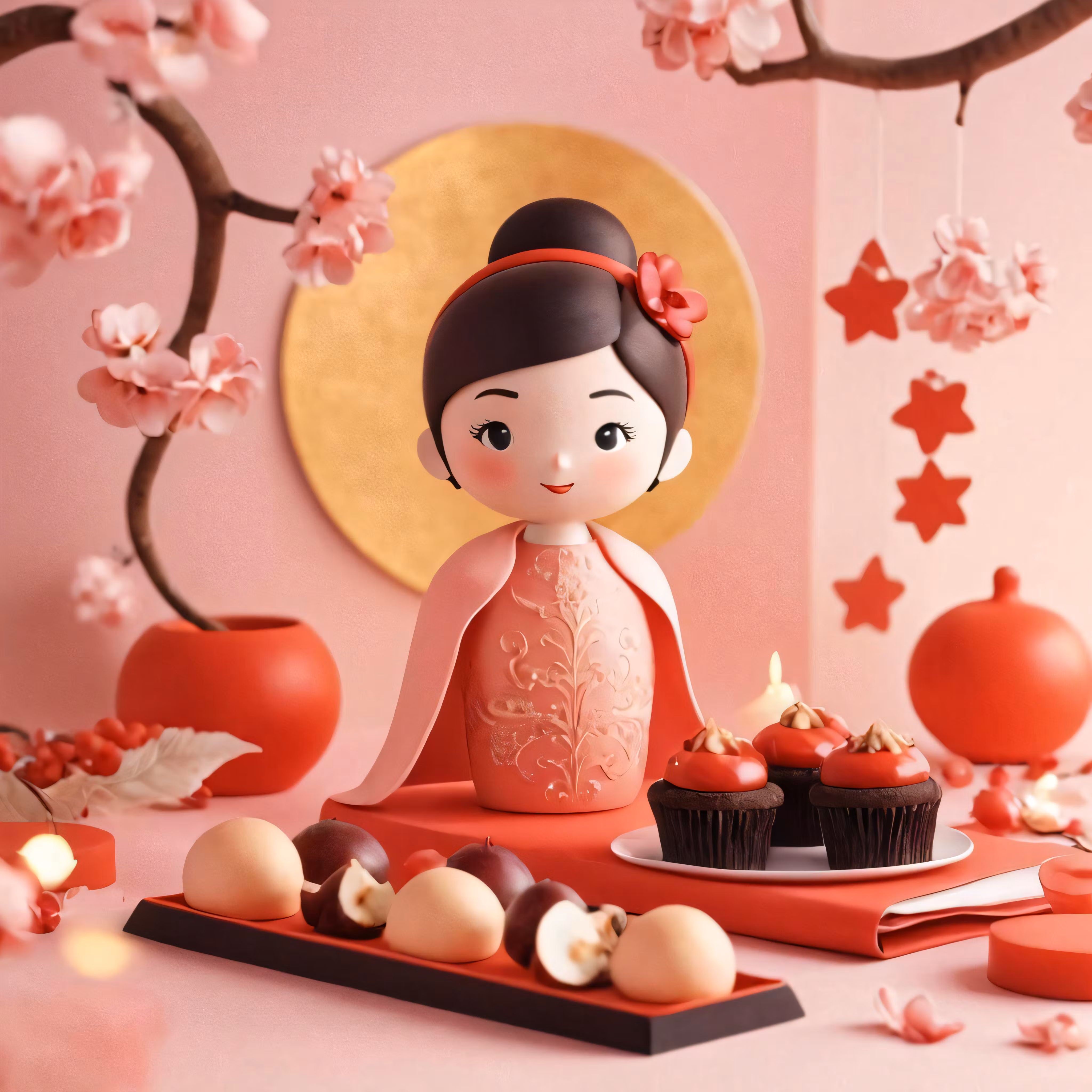 High resolution picture, free to use, a small doll is posed in front of an array of sweets