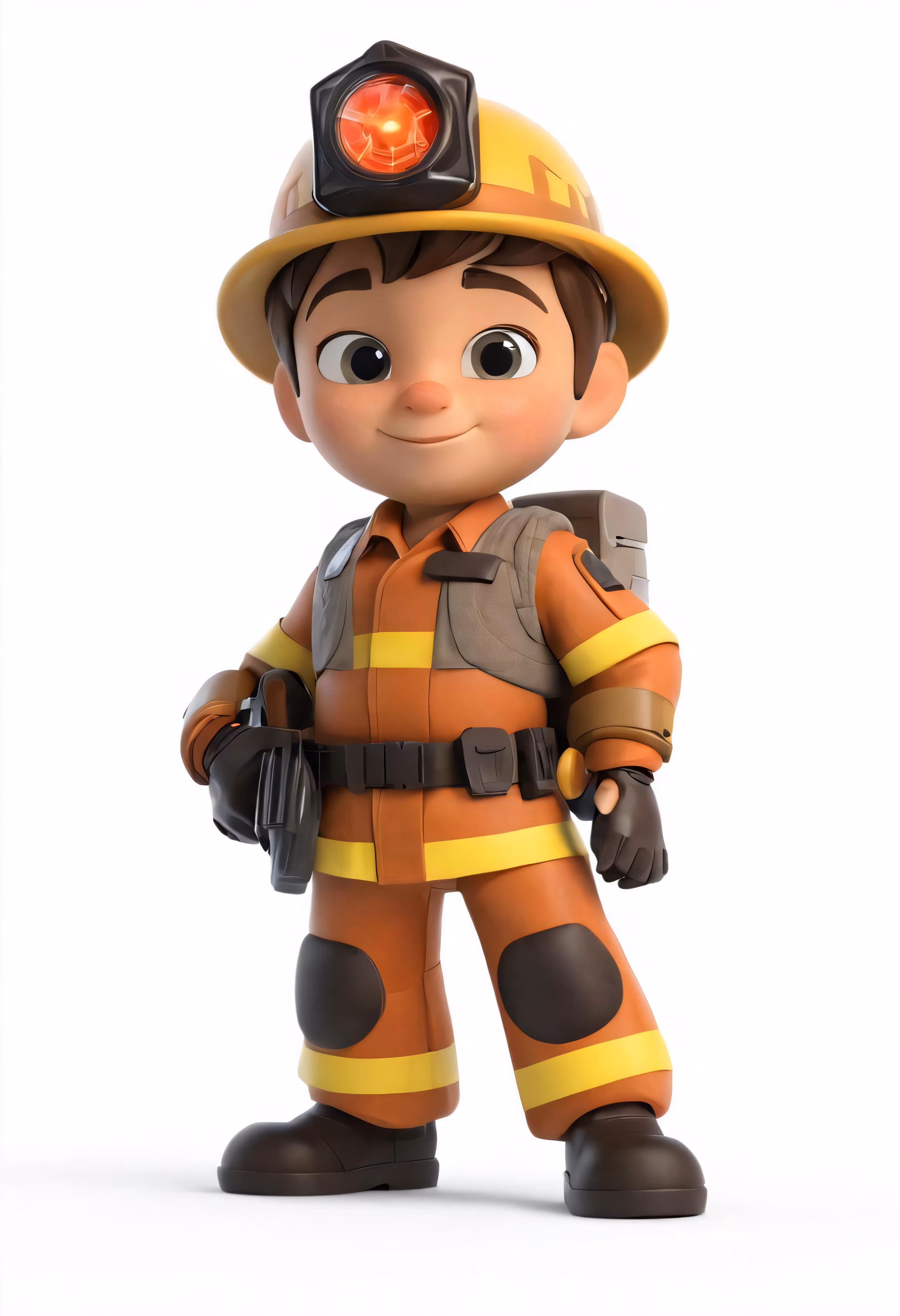 High resolution picture, free to use, a small fire fighter boy with an orange helmet