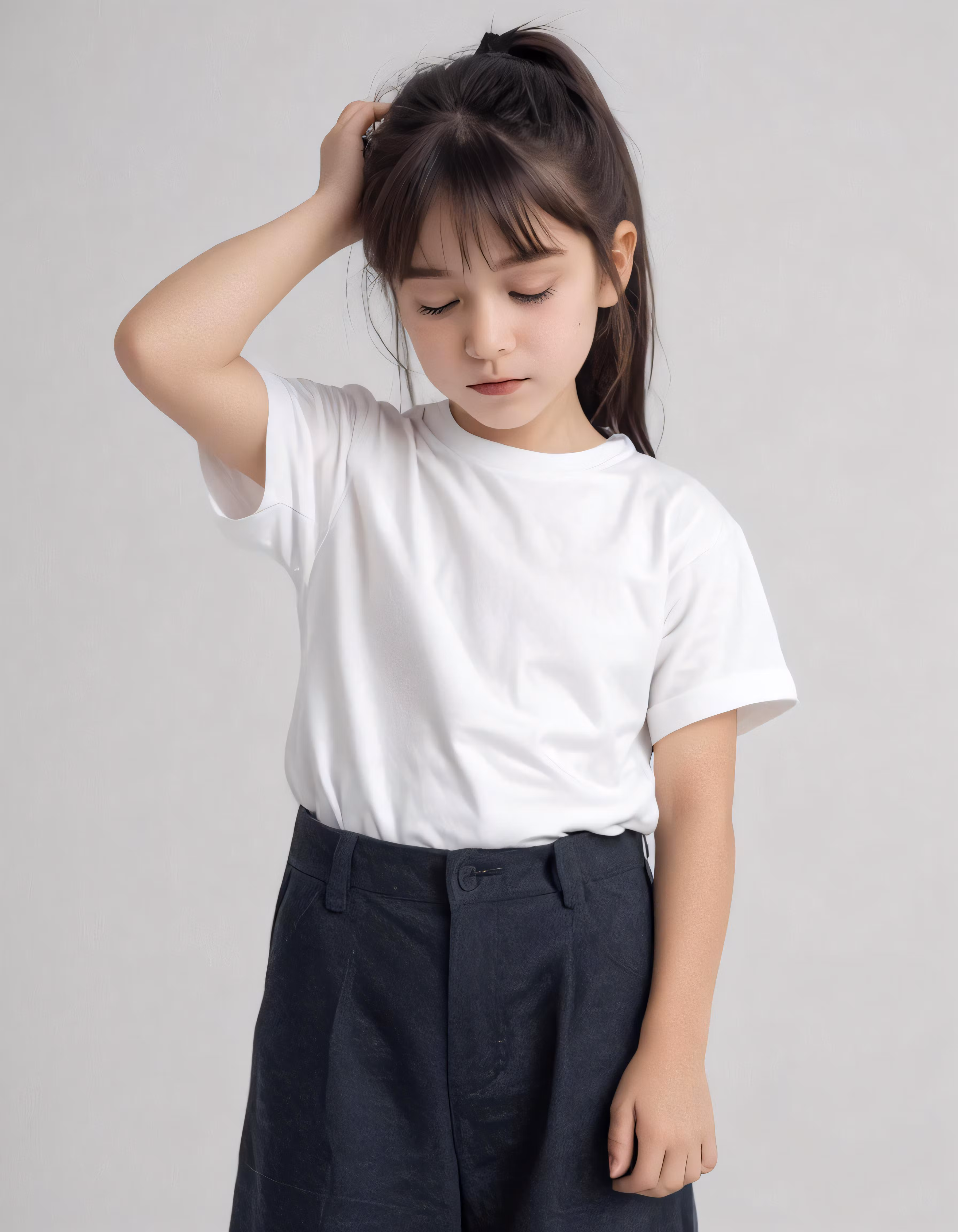 High resolution picture, free to use, a small girl is wearing dark blue shorts and a white t   shirt