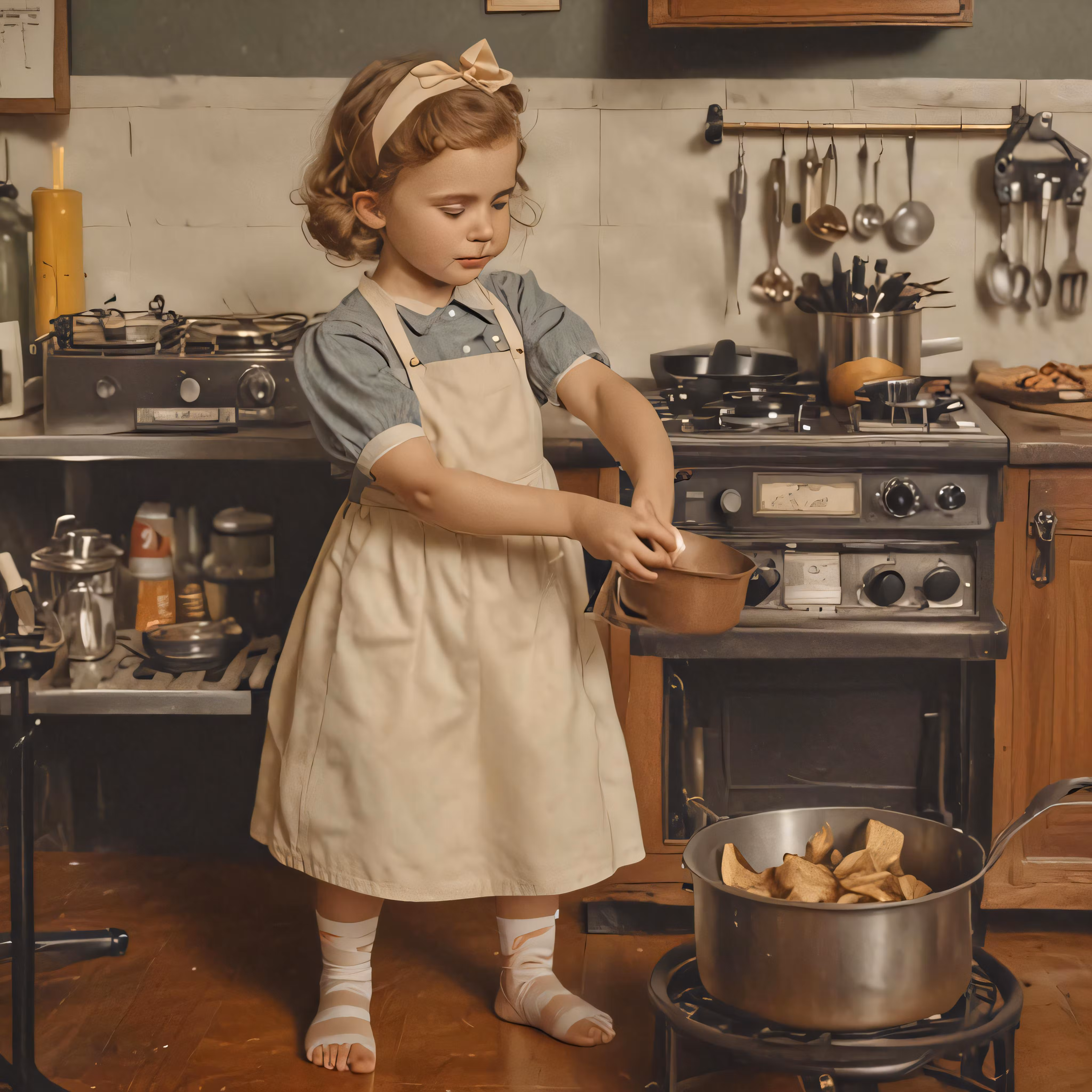 High resolution picture, free to use, a small girl stands next to a pan and a stove