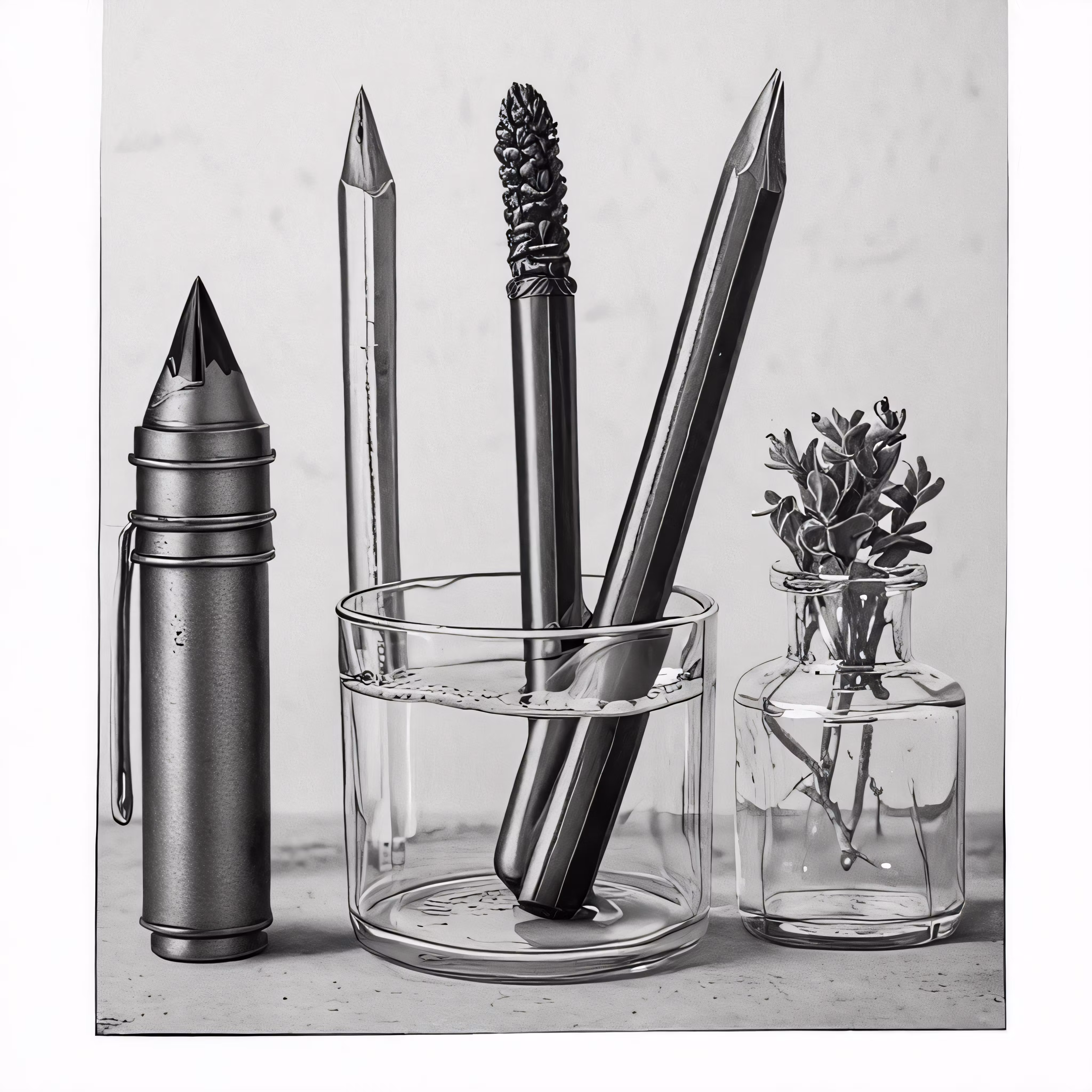 High resolution picture, free to use, a small glass bowl filled with pens and an empty vase