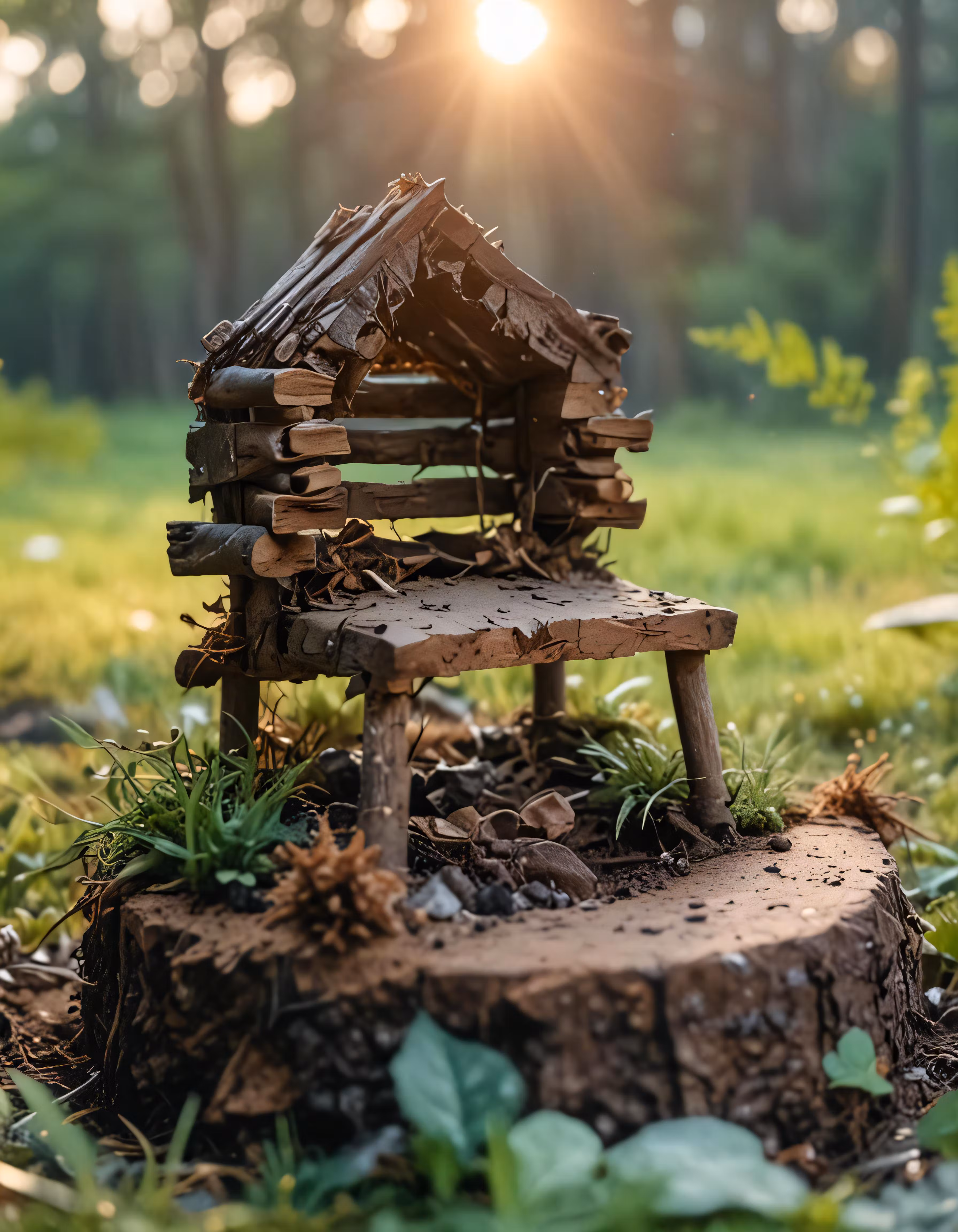 High resolution picture, free to use, a small house made of wood on a tree stump