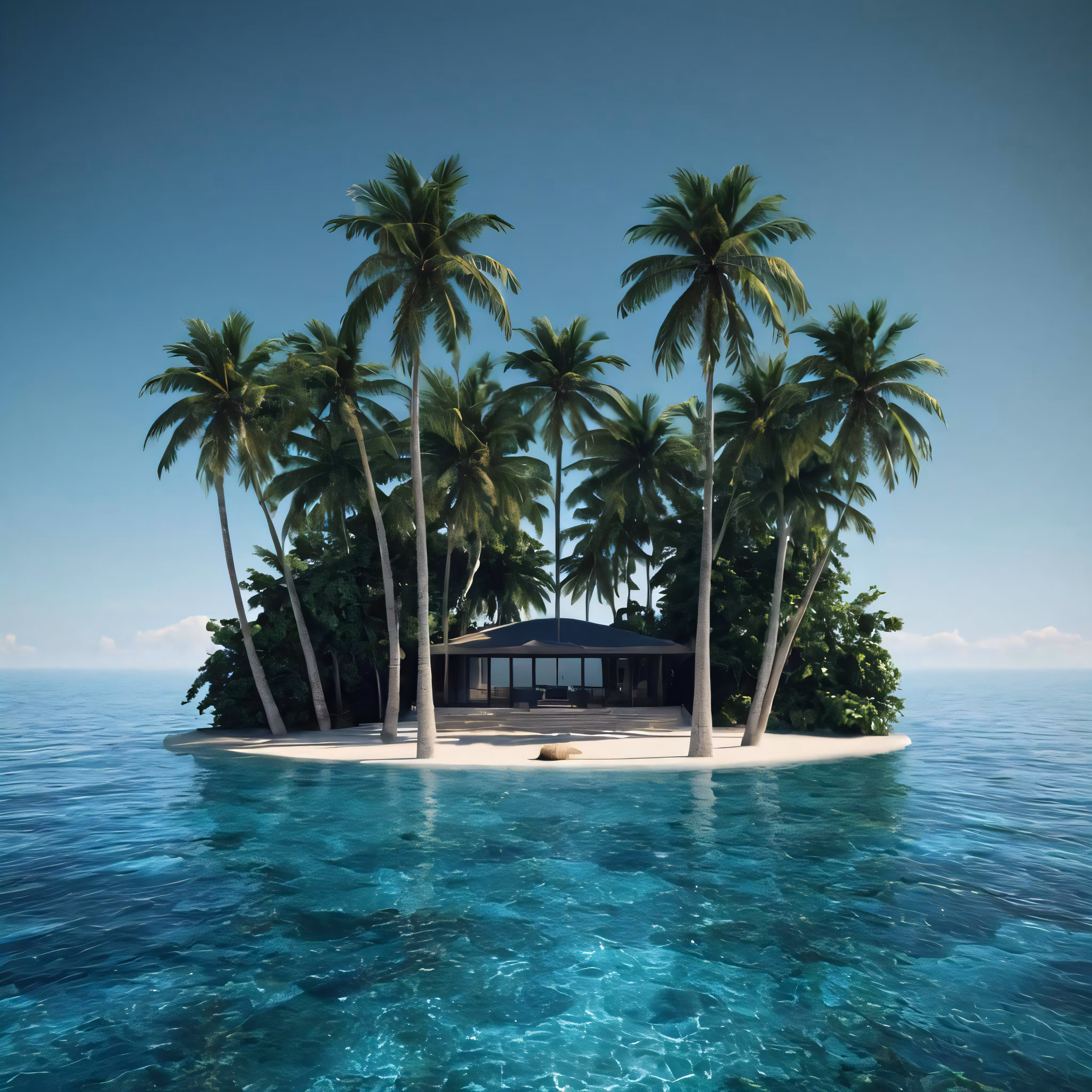 High resolution picture, free to use, a small house on a small island with several palm trees