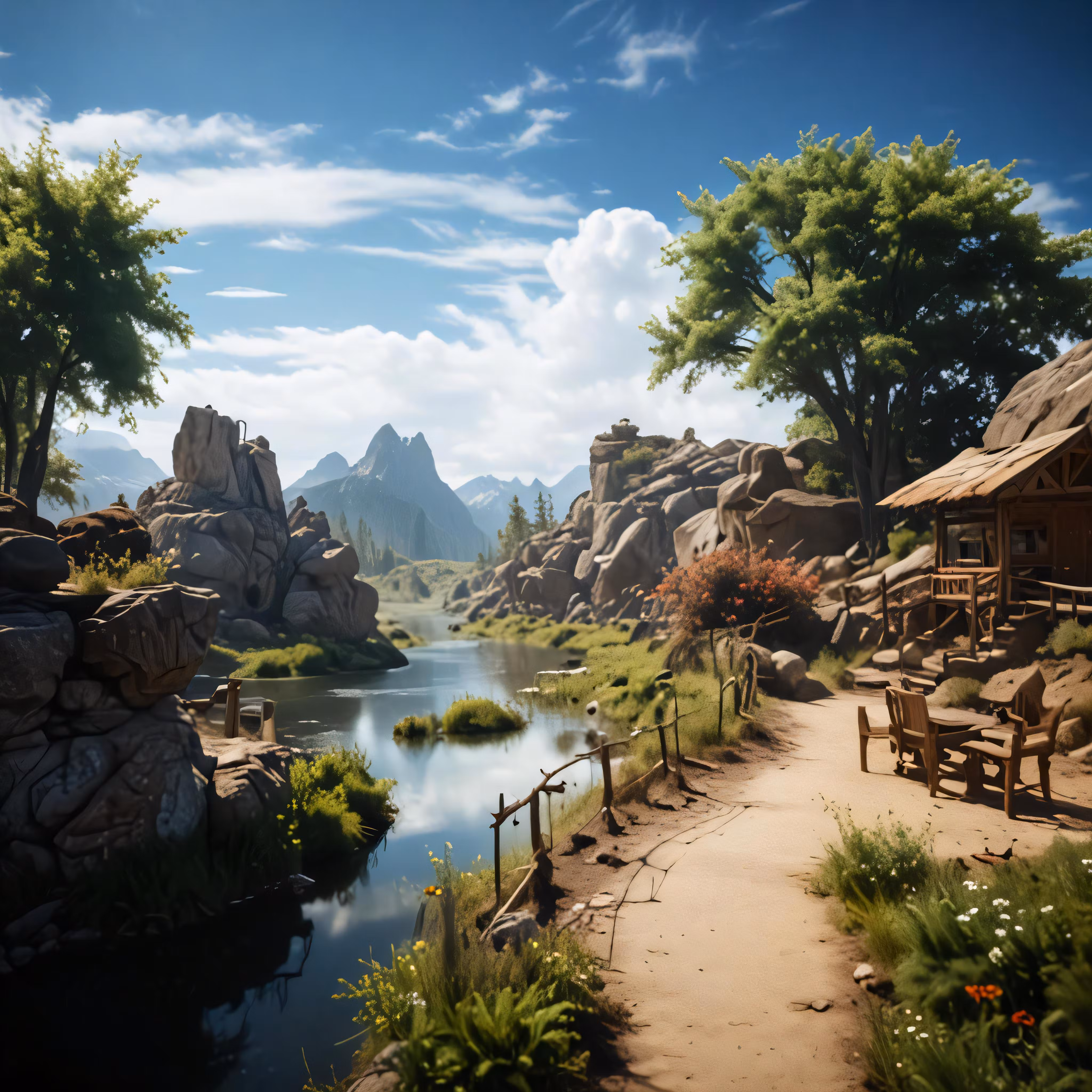 High resolution picture, free to use, a small pond and tables in a desert like area