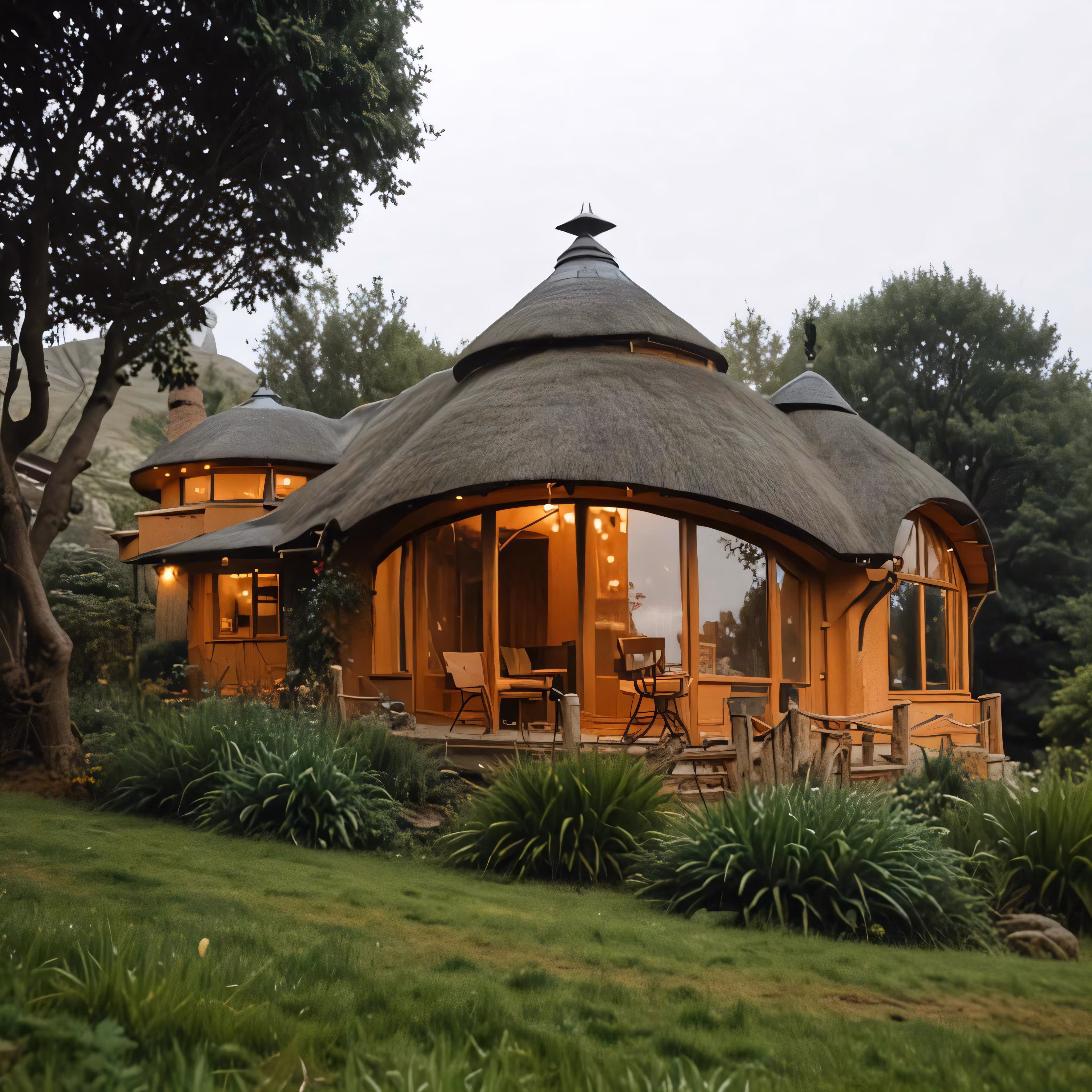 High resolution picture, free to use, a small round wooden cabin in a field