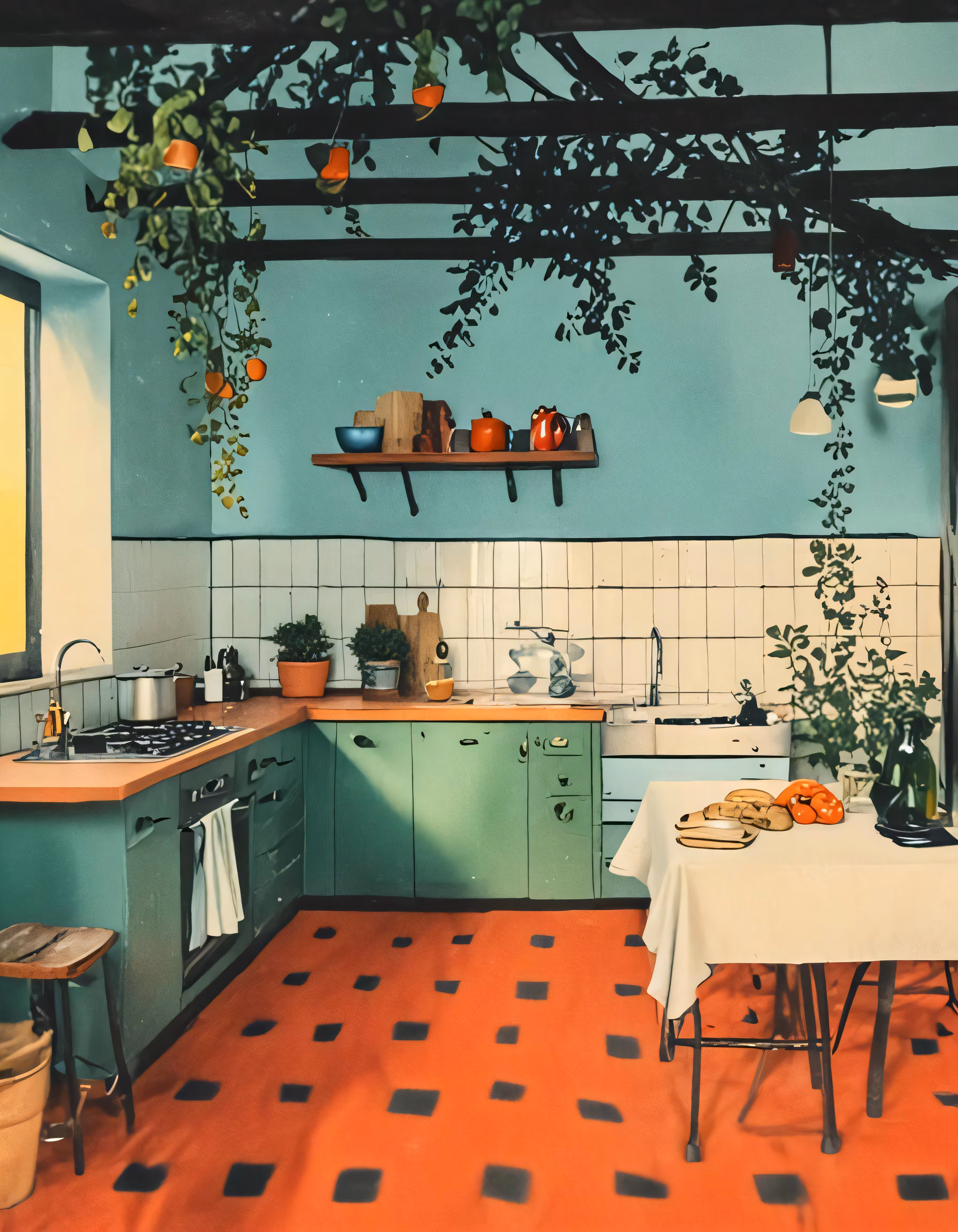 High resolution picture, free to use, a small table is set up in a colorful kitchen