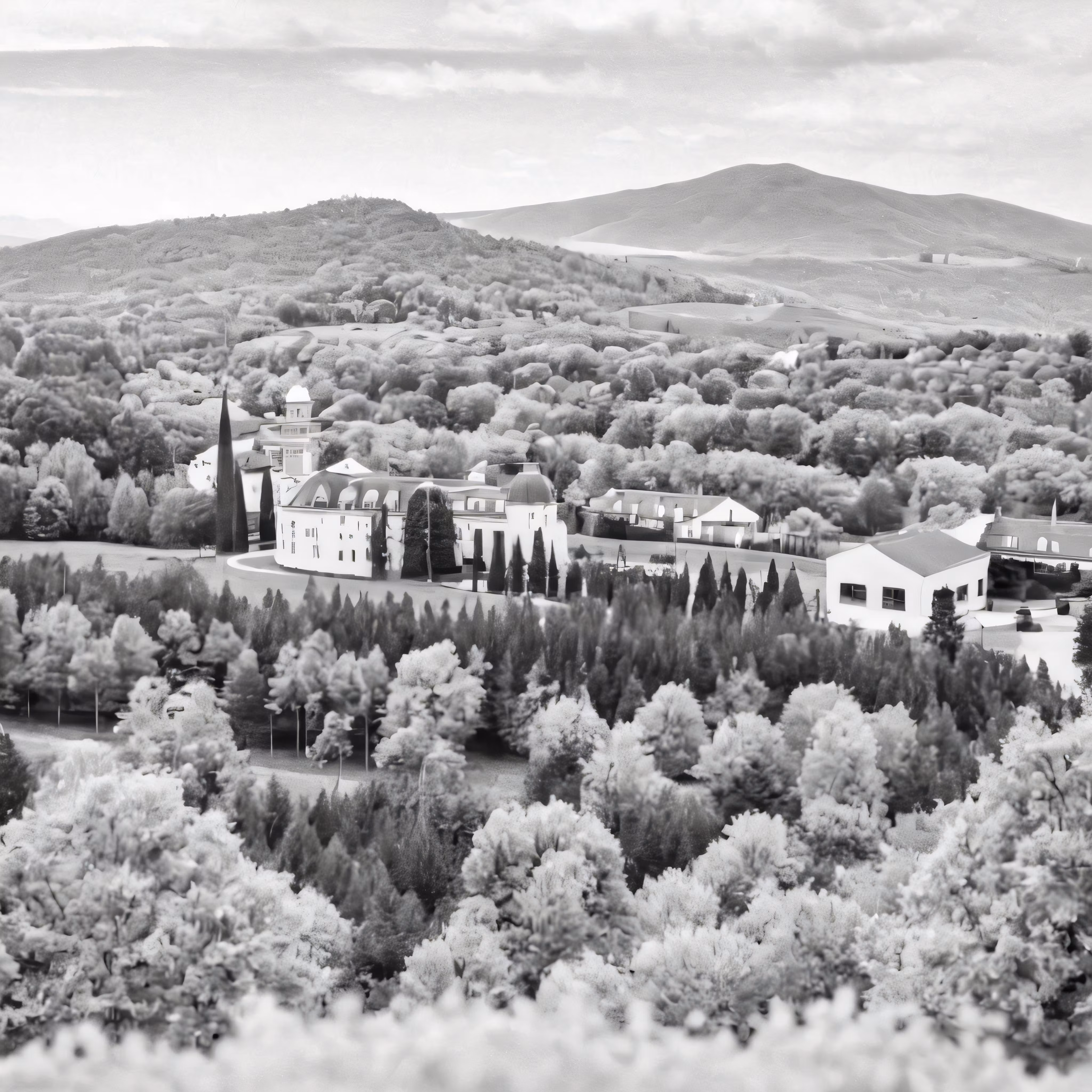 High resolution picture, free to use, a small town surrounded by wooded trees near mountains