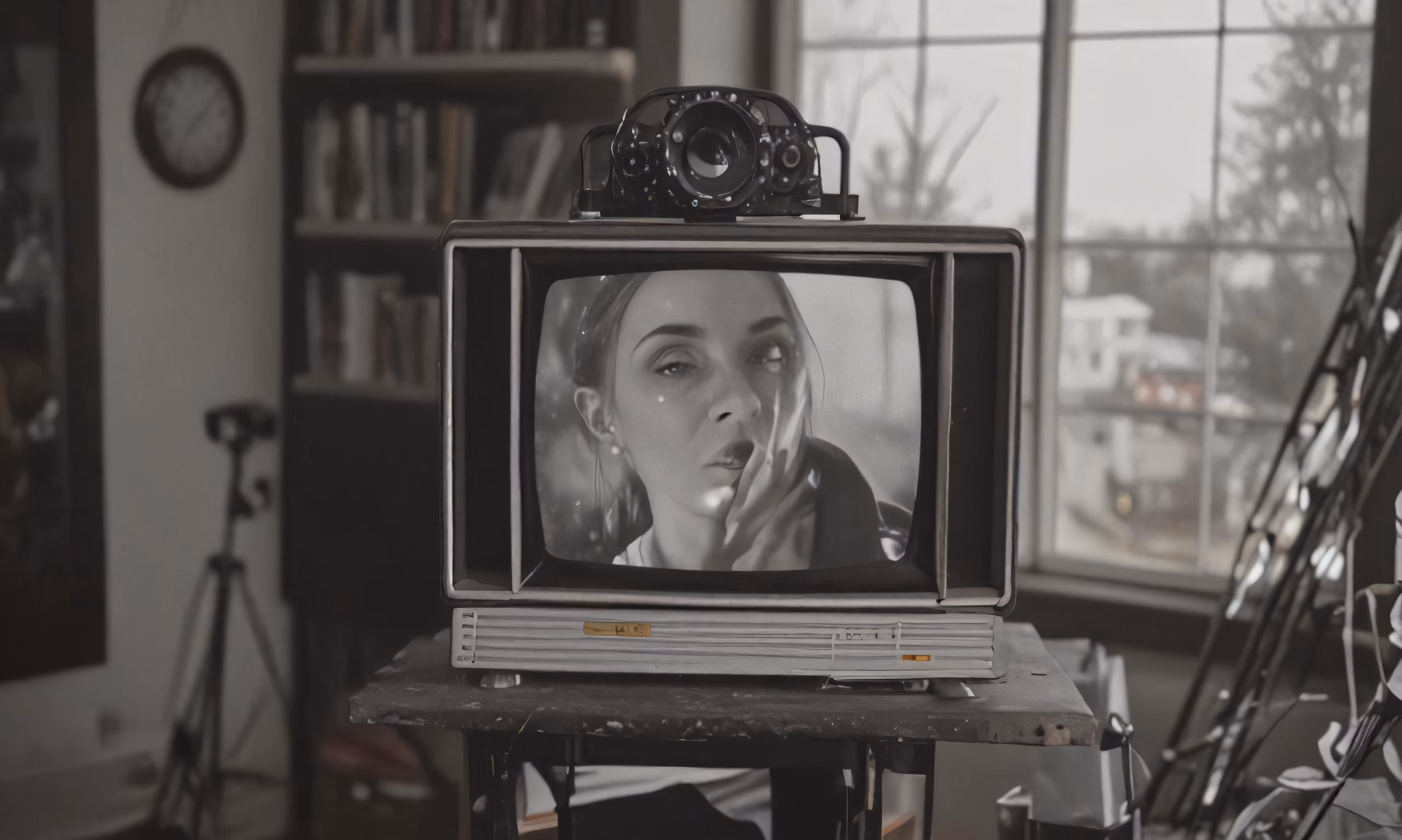 High resolution picture, free to use, a small tv in front of a window and a camera on the shelf
