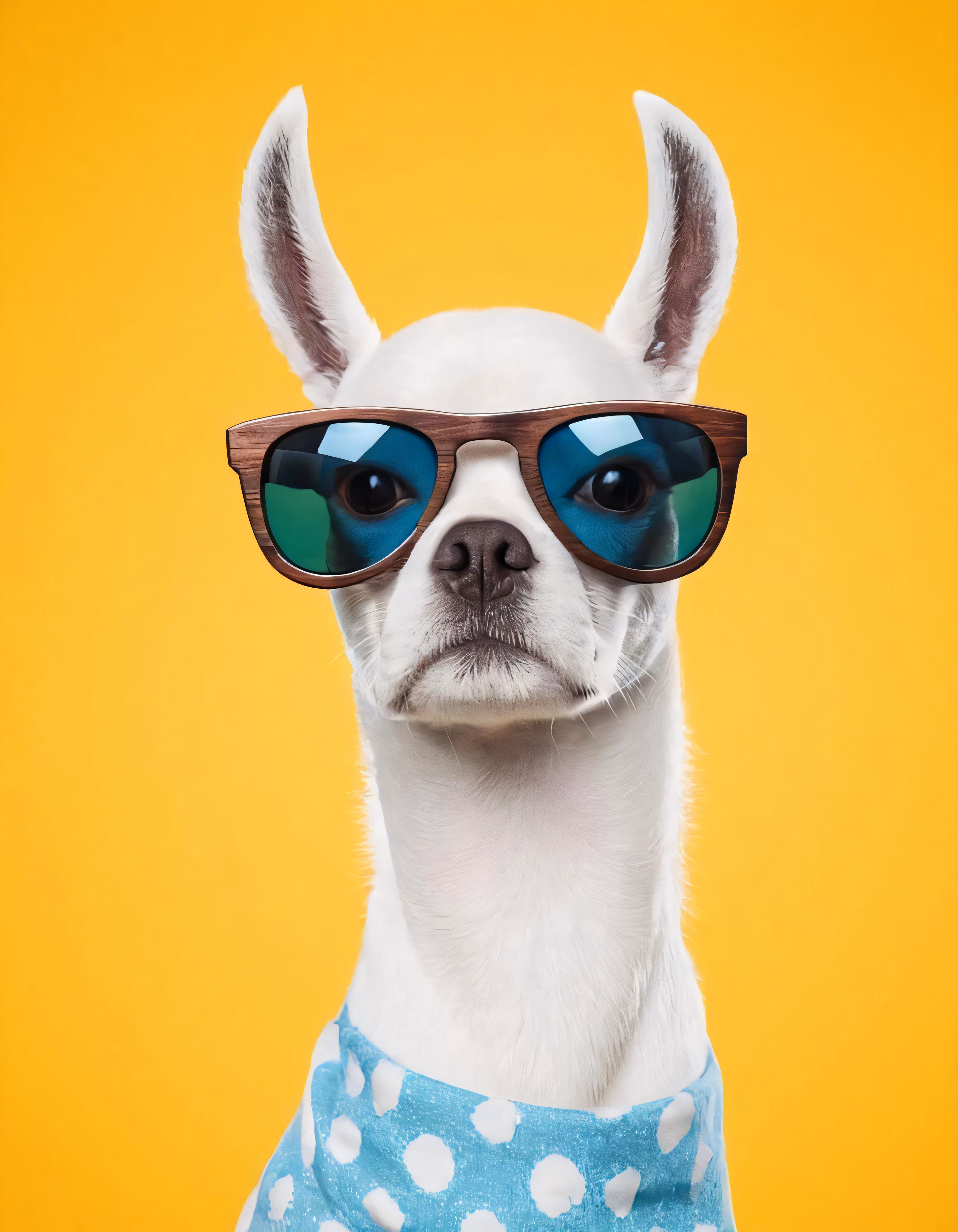 High resolution picture, free to use, a small white dog in sunglasses on a yellow background