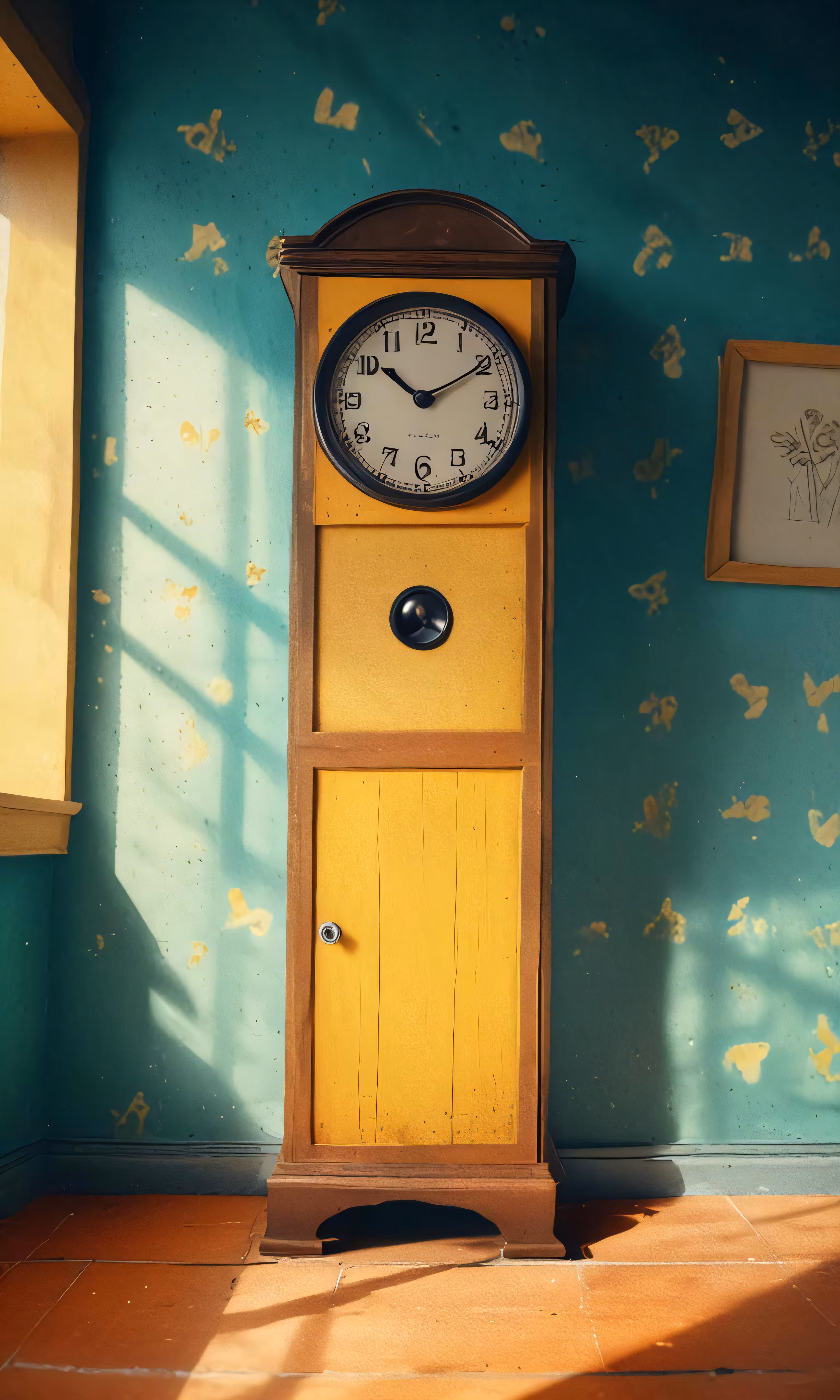 High resolution picture, free to use, a small wooden grandfather clock sitting in front of a window
