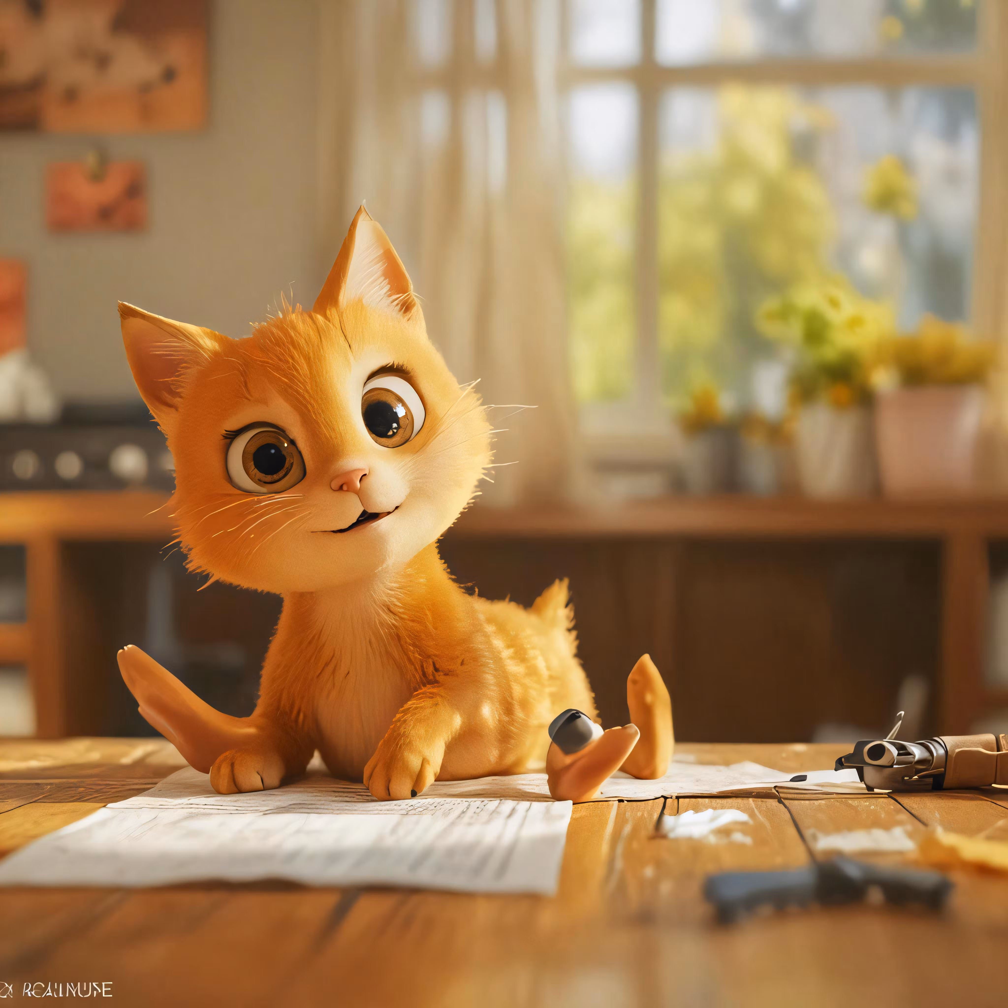 High resolution picture, free to use, a small yellow cat sits on the floor next to paperwork