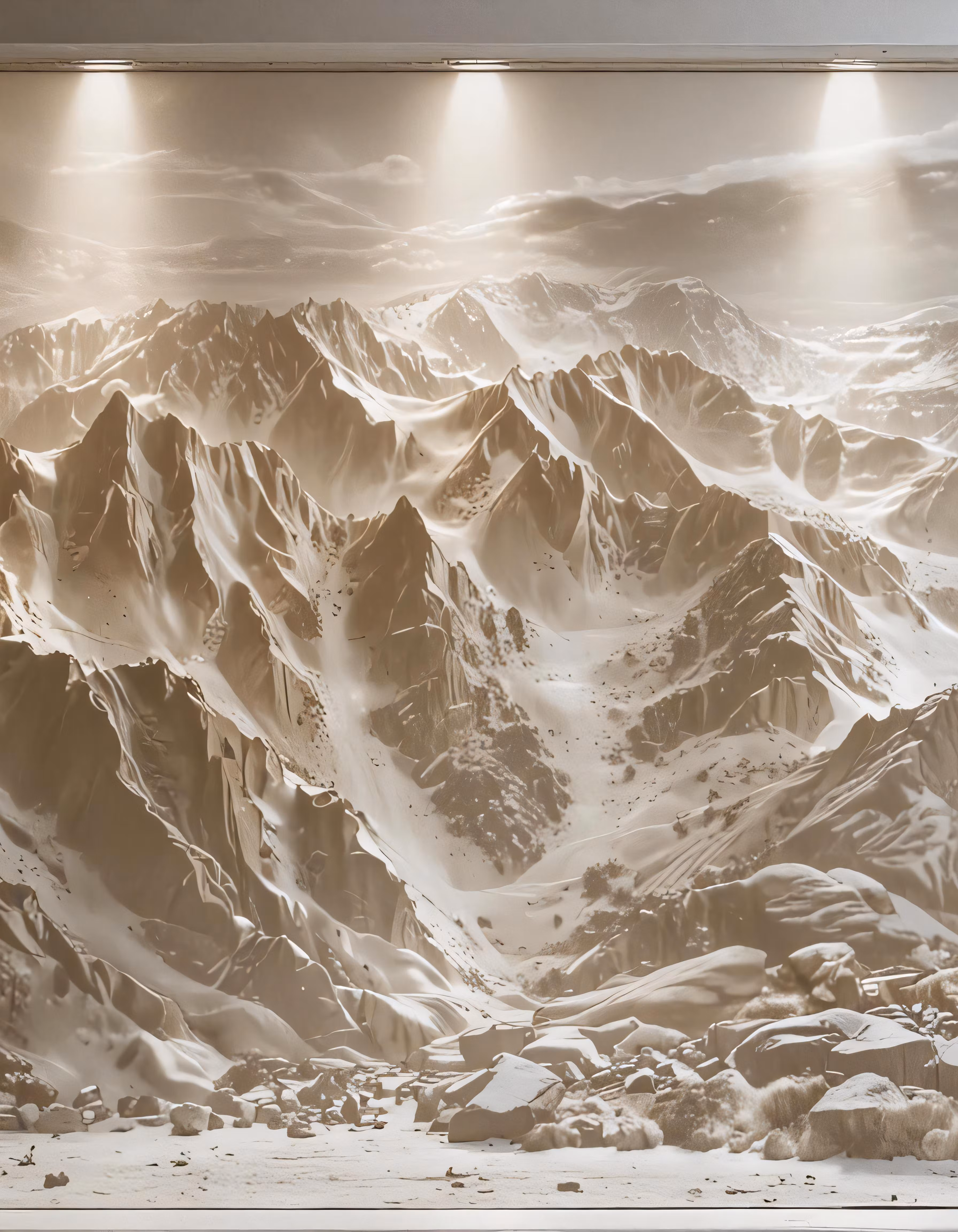 High resolution picture, free to use, a snow covered mountain range under sunlight beam from above