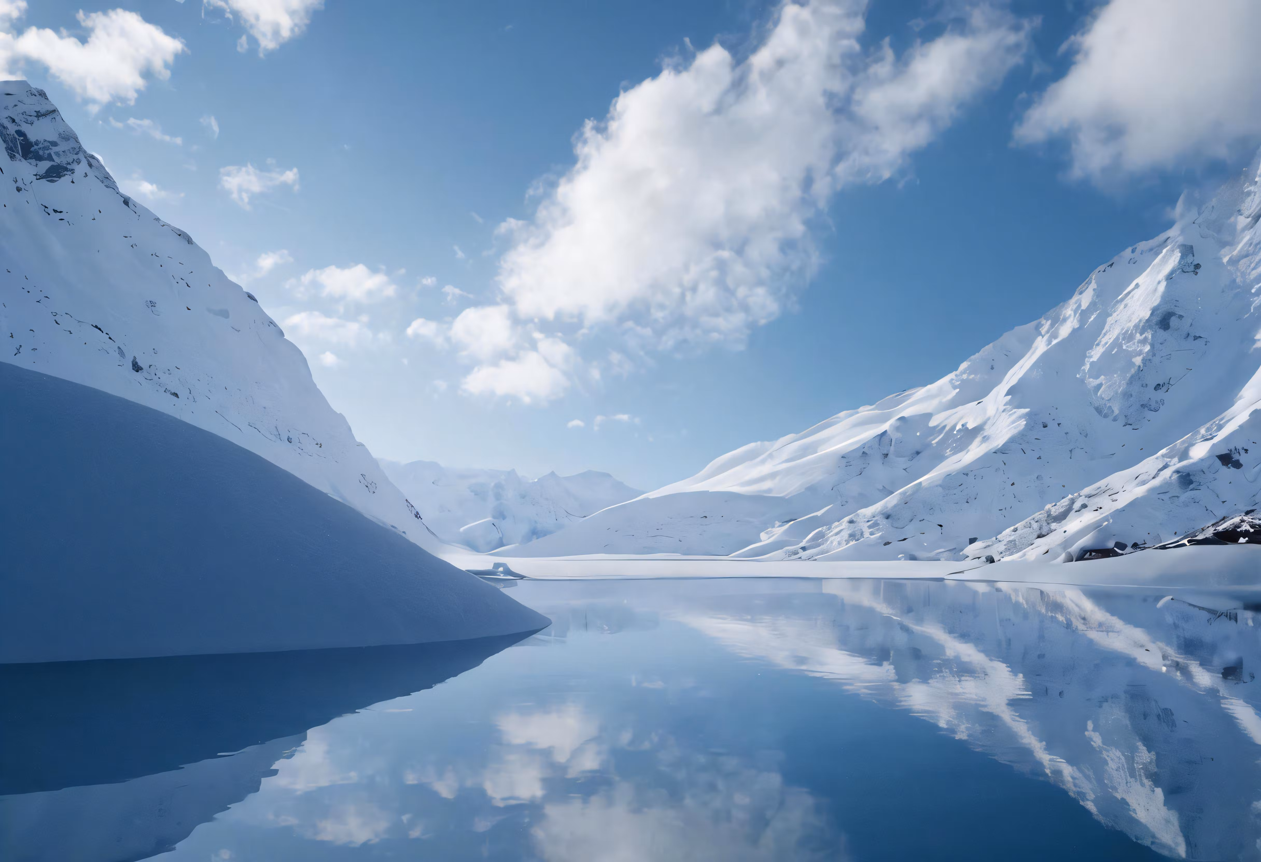 High resolution picture, free to use, a snow covered mountain that is next to a body of water