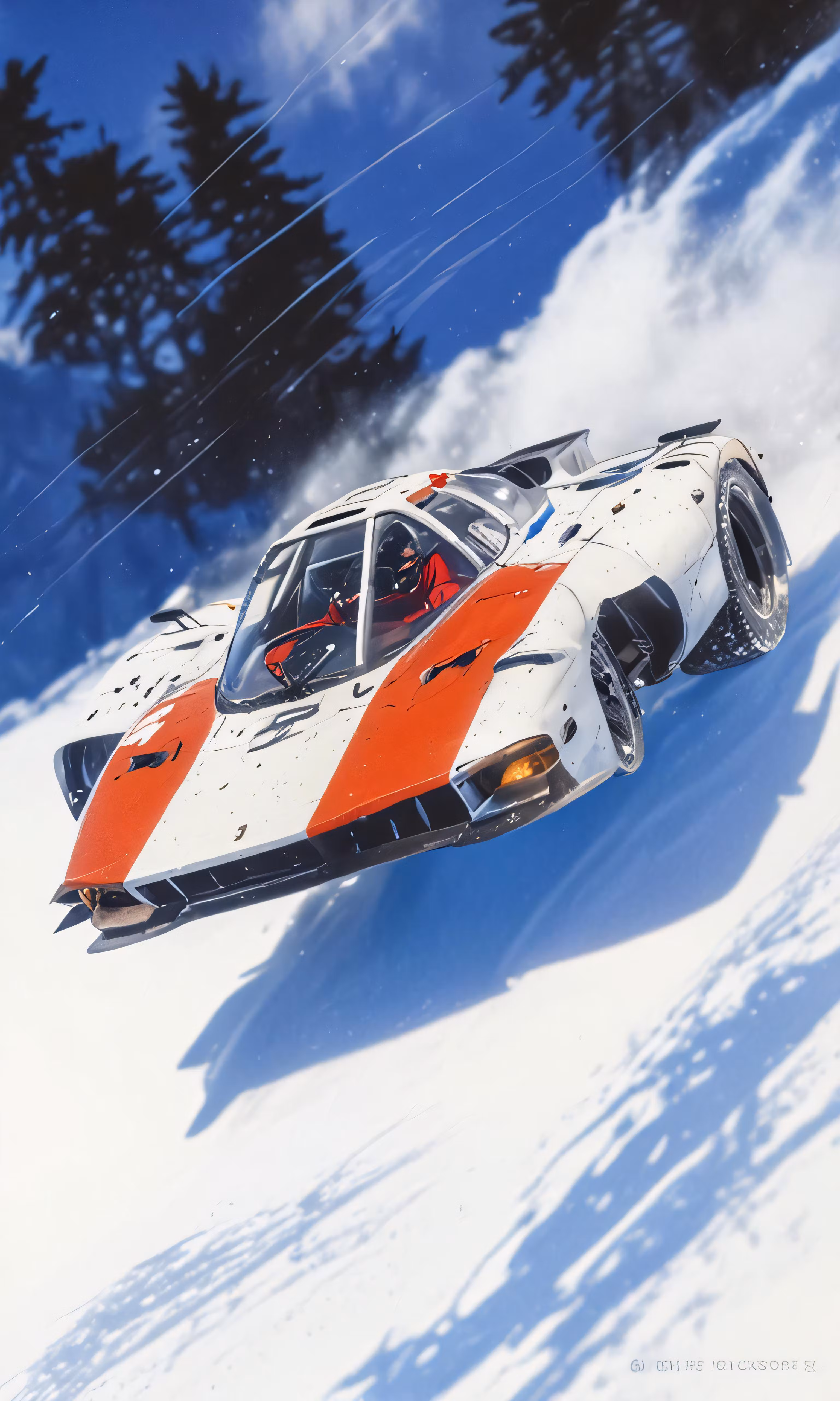 High resolution picture, free to use, a snow racer car driving down the slope in deep snow
