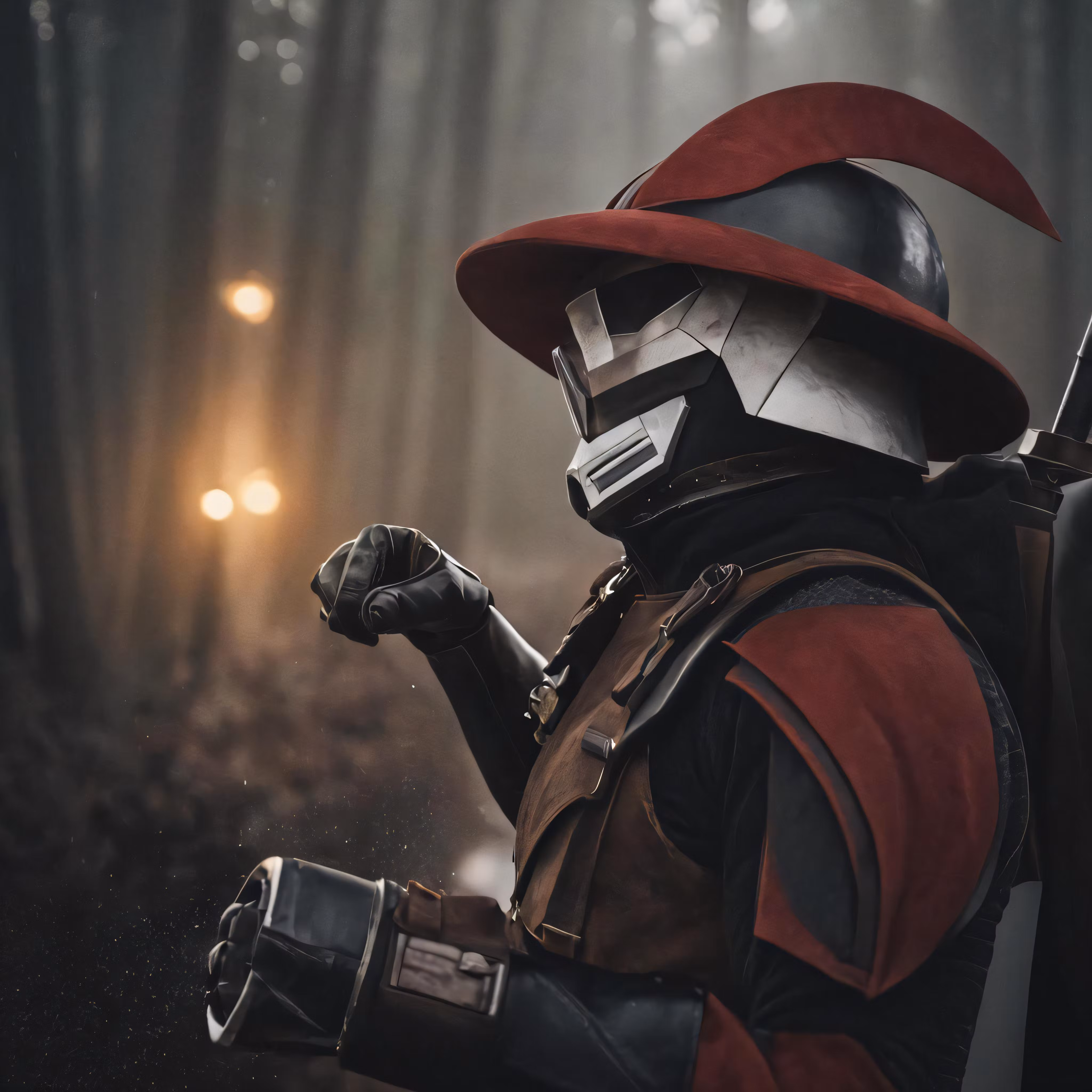 High resolution picture, free to use, a star wars character stands in the woods at night, holding his gun