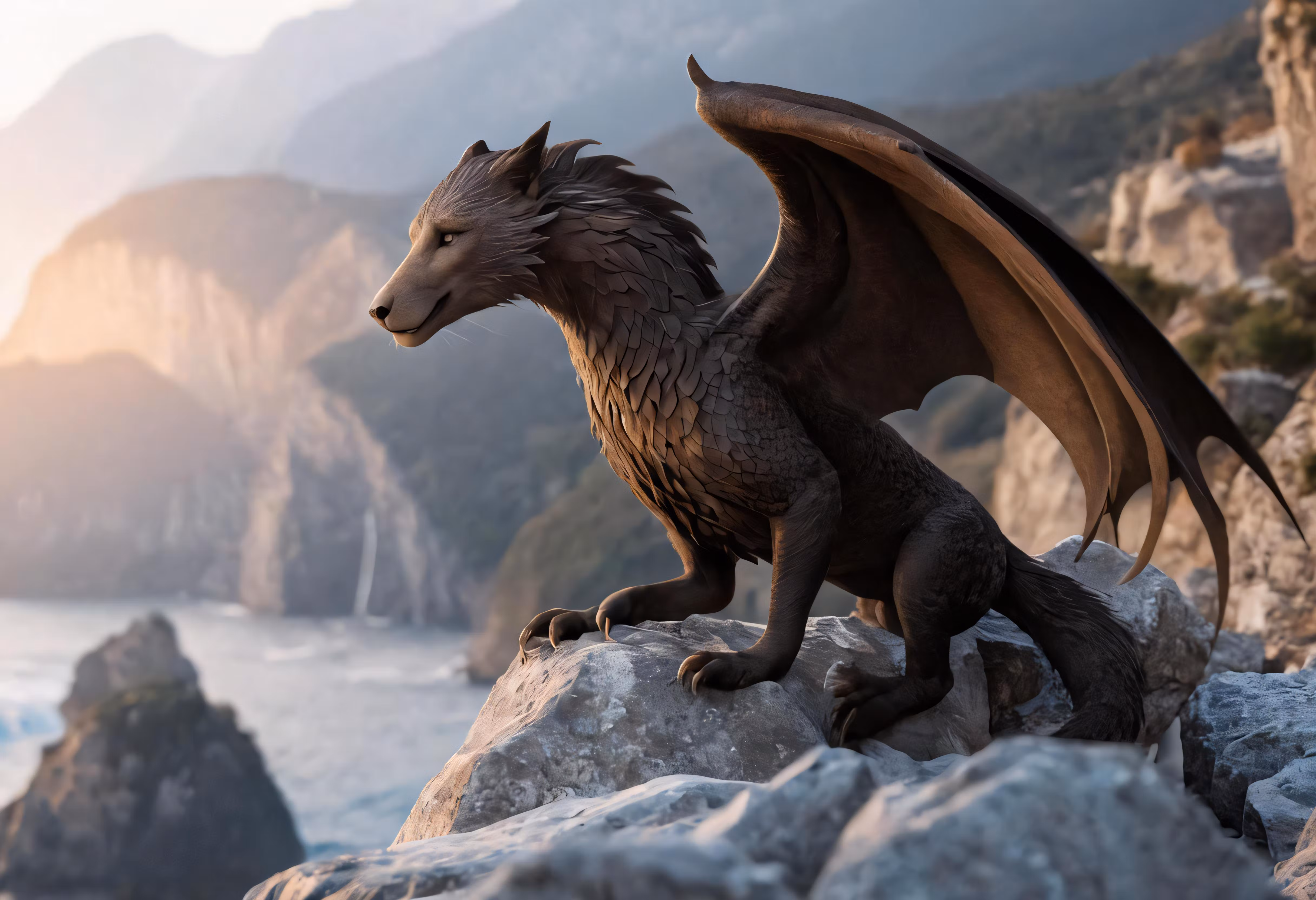High resolution picture, free to use, a statue of a dragon on a rocky cliff near the ocean