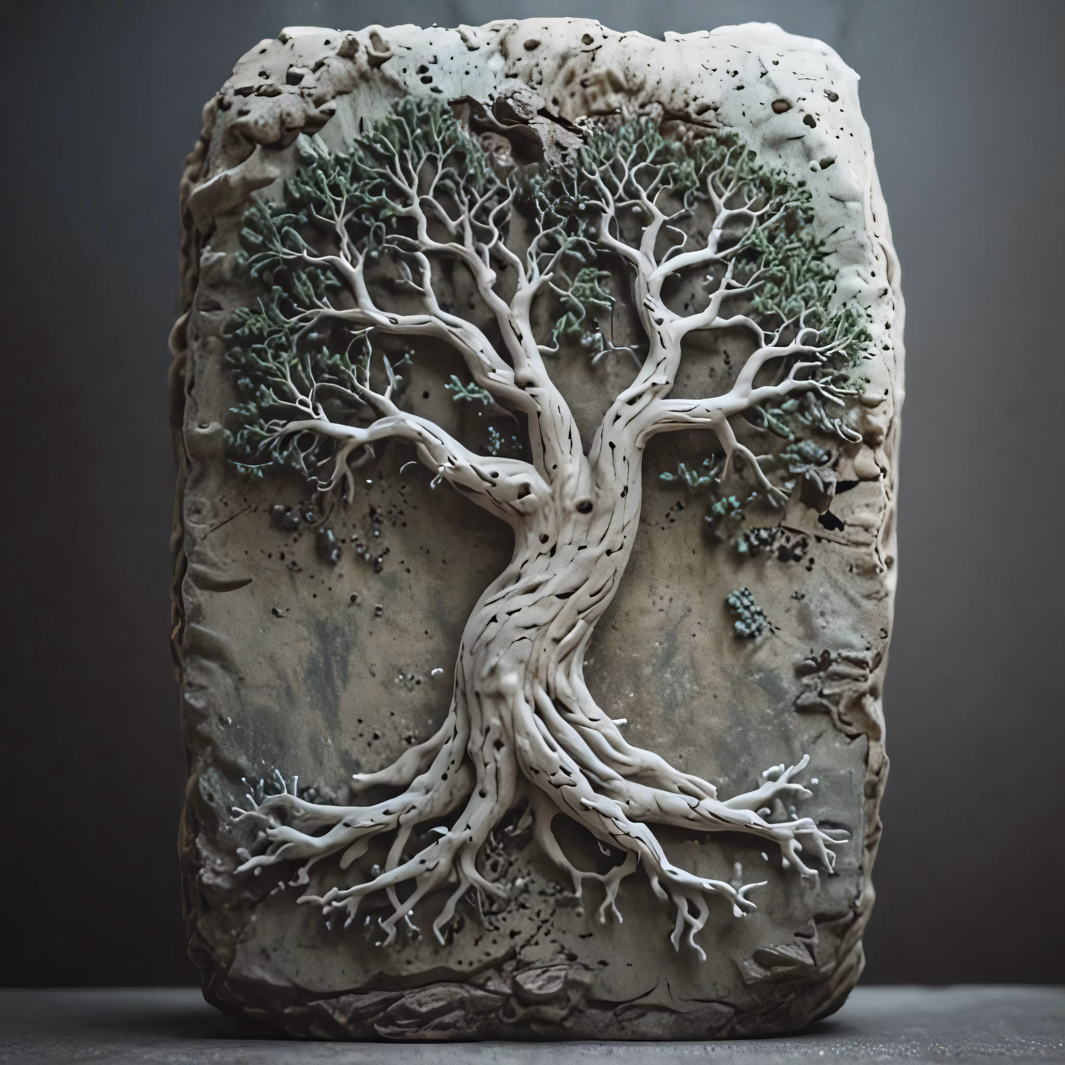 High resolution picture, free to use, a statue of a tree on top of rocks