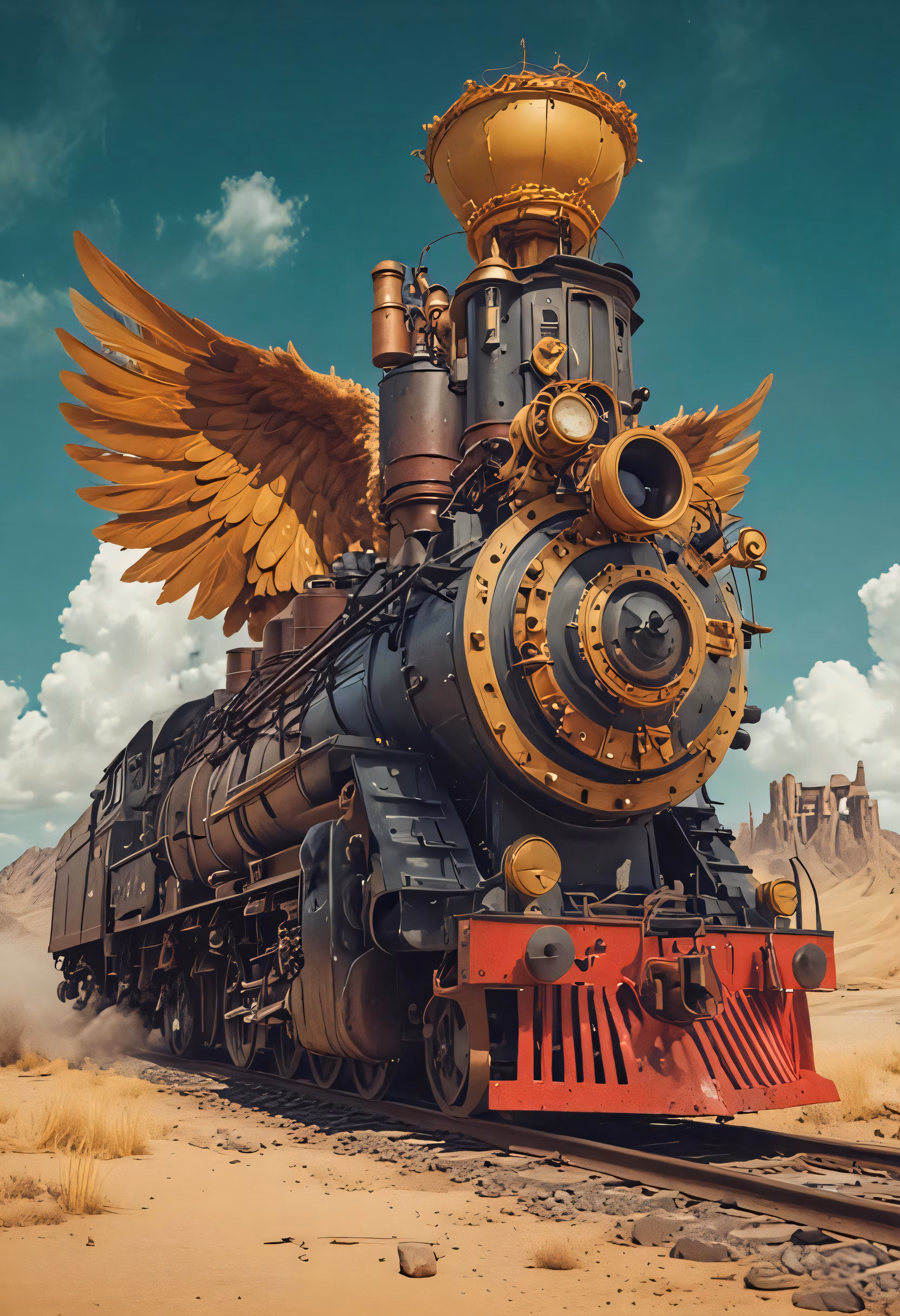 High resolution picture, free to use, a steam powered train on a track in the desert