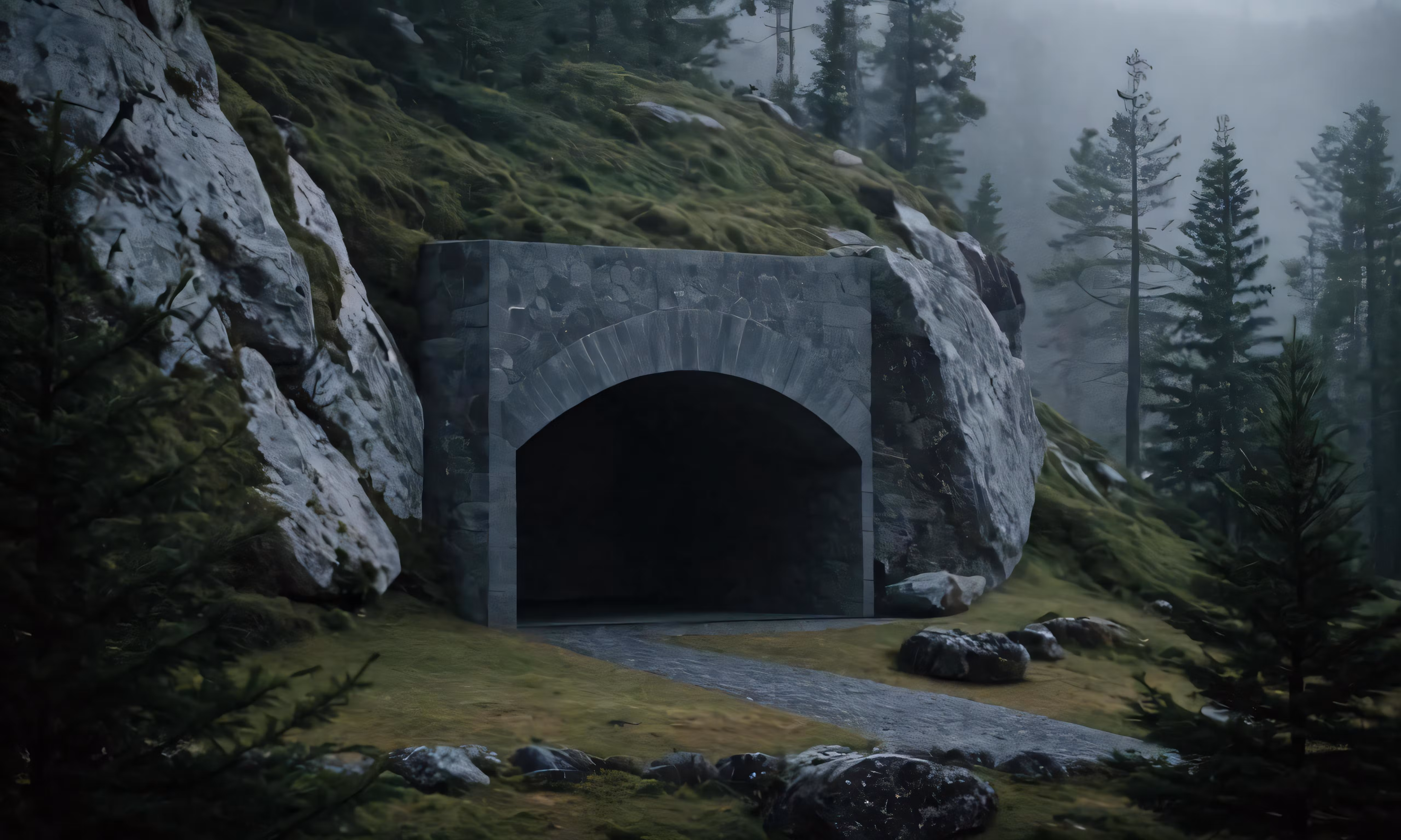 High resolution picture, free to use, a stone tunnel on a foggy and wooded trail