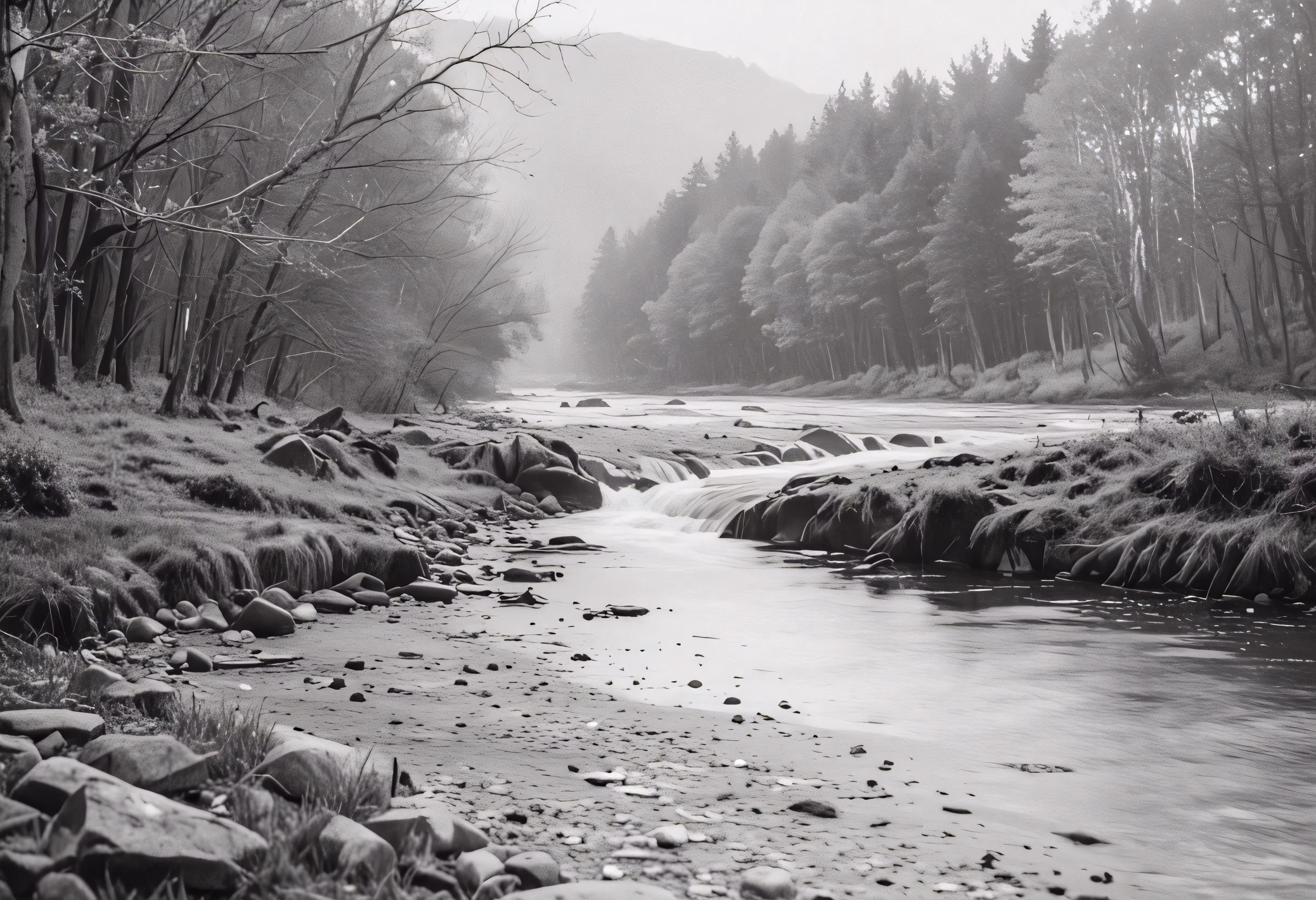 High resolution picture, free to use, a stream running between some rocks near some trees