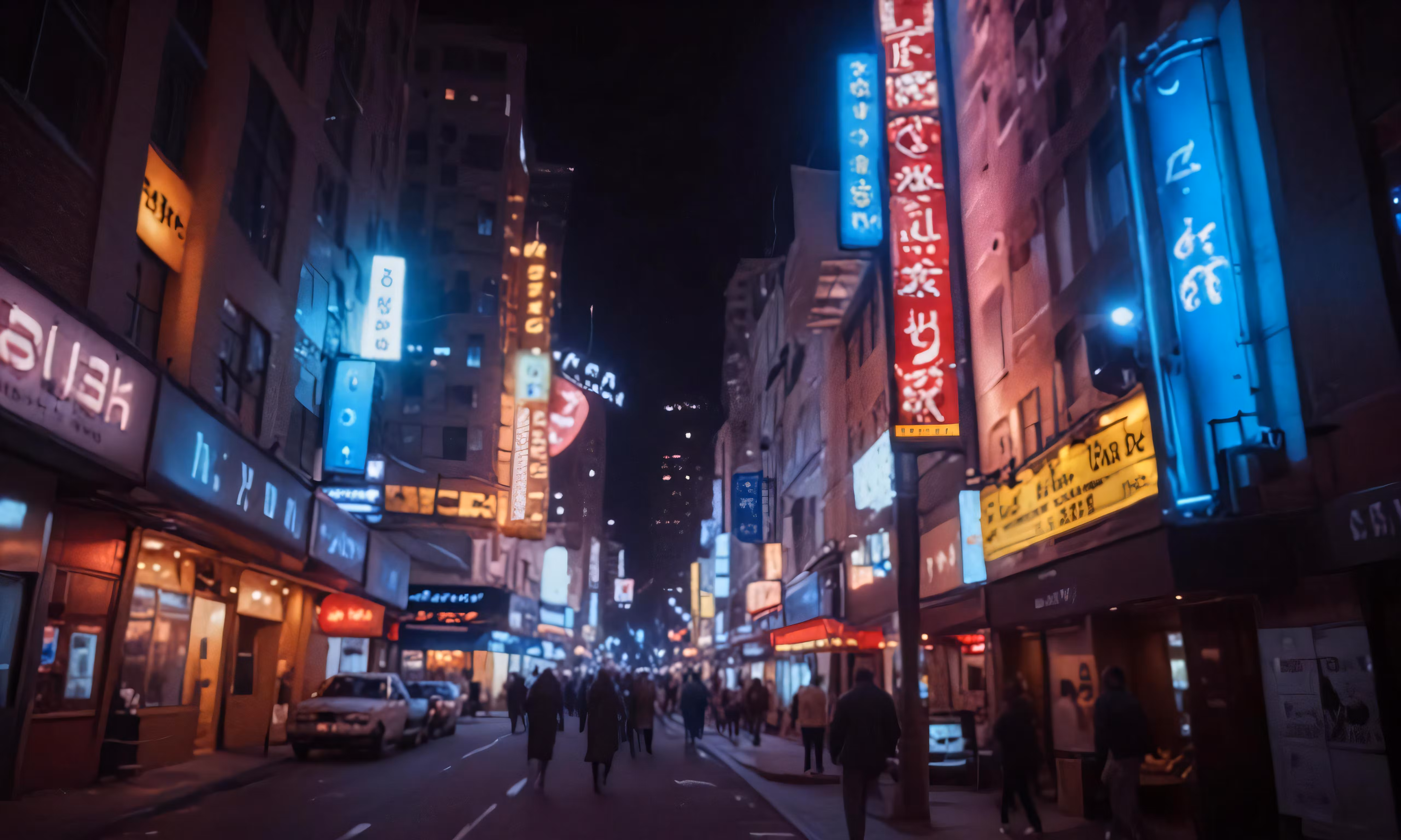 High resolution picture, free to use, a street at night with people walking on the sidewalk and buildings along the street