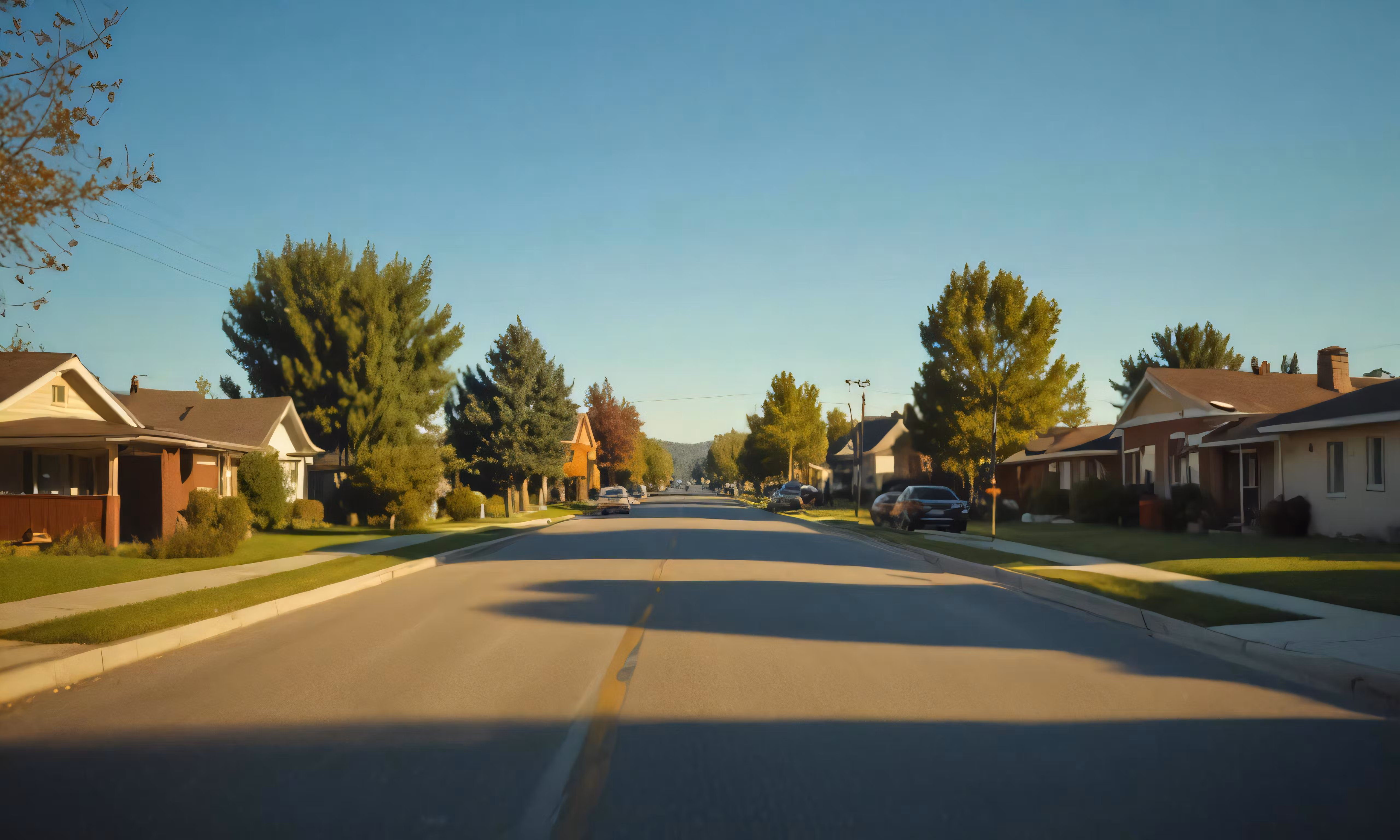 High resolution picture, free to use, a street with houses, cars, and parked vehicles