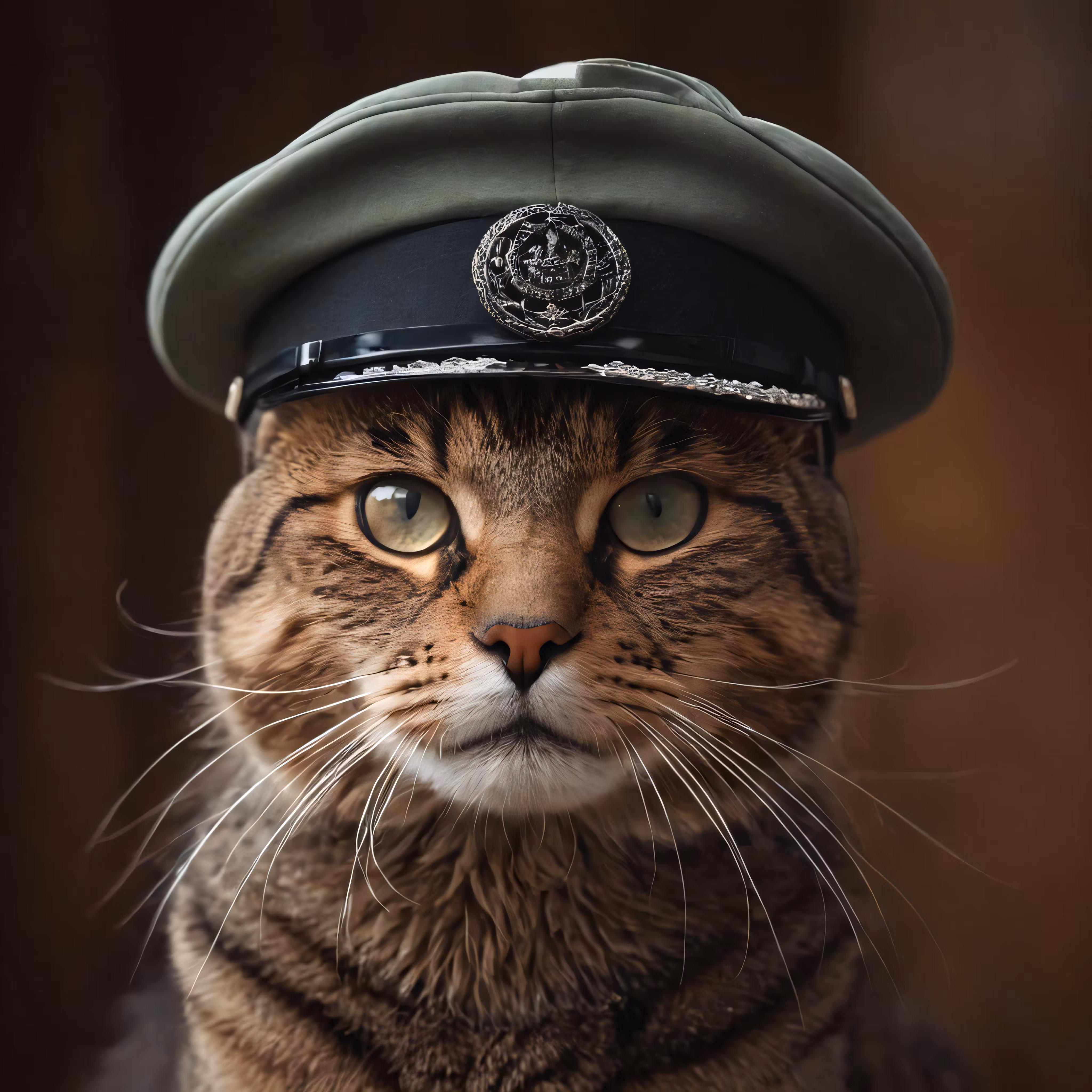 High resolution picture, free to use, a striped cat wearing a hat with the insignia on