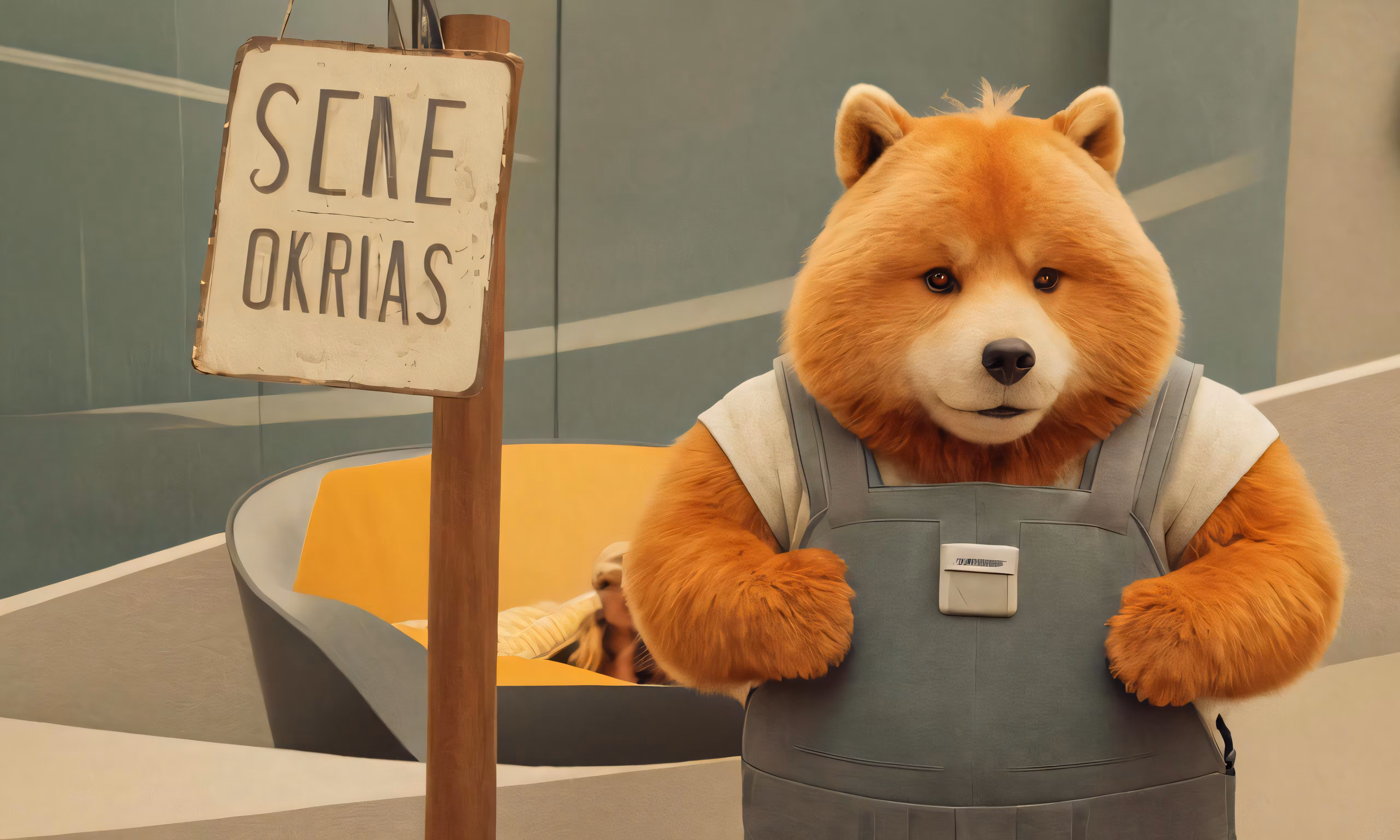 High resolution picture, free to use, a stuffed bear holding a sign next to a curved building