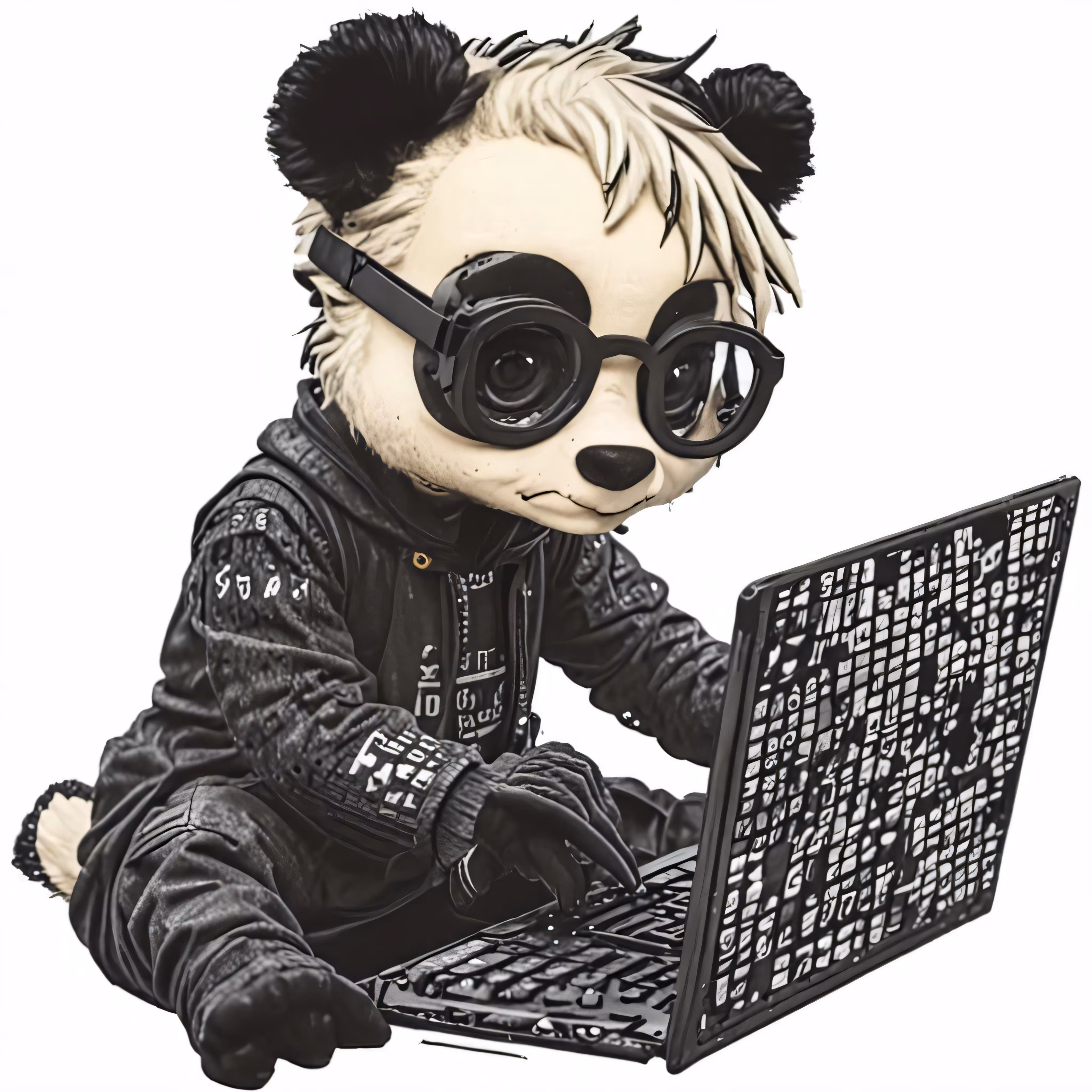 High resolution picture, free to use, a stuffed panda bear wearing glasses is typing on a laptop