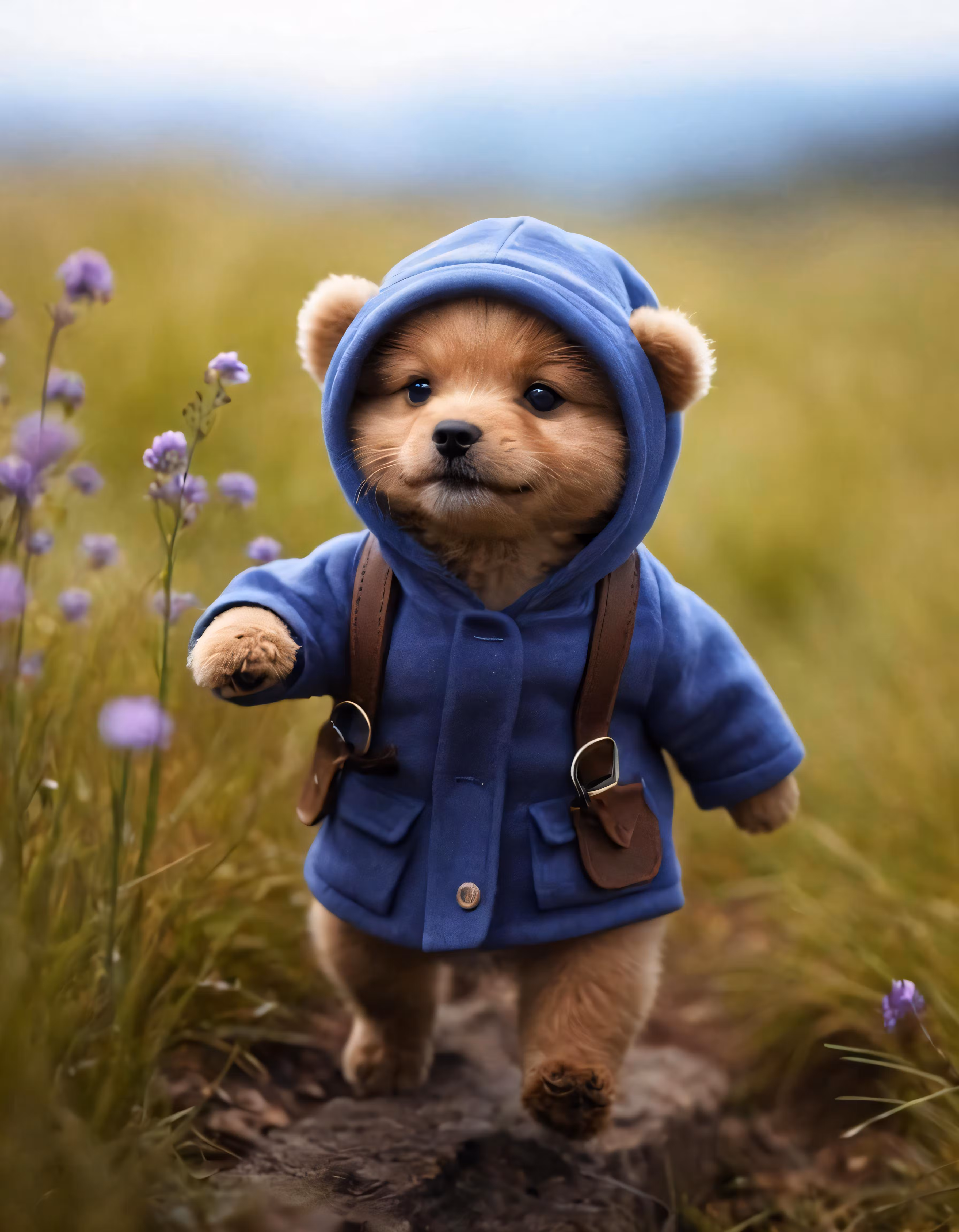 High resolution picture, free to use, a stuffed teddy bear dressed in blue clothes in a field