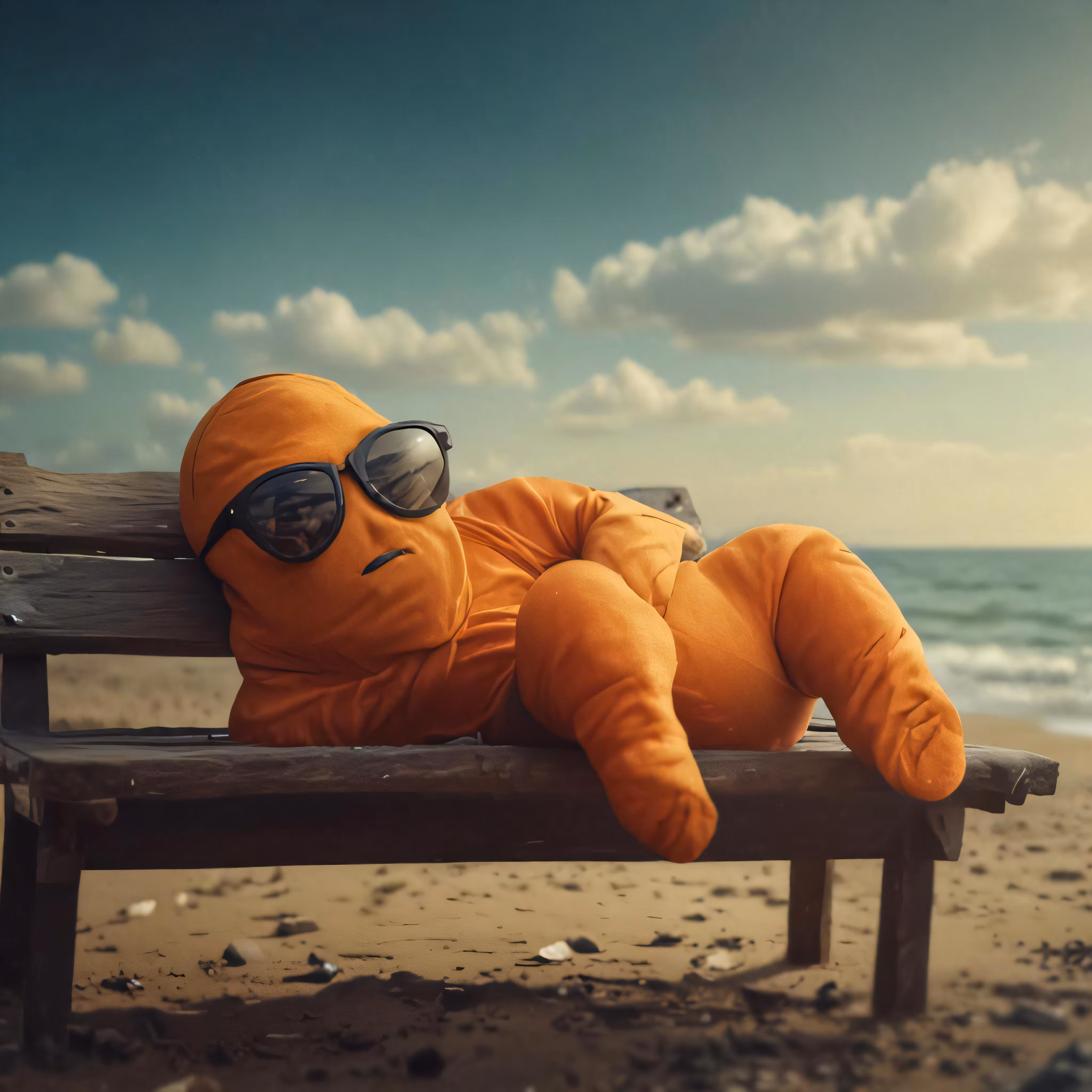High resolution picture, free to use, a stuffed toy is wearing sunglasses on a bench