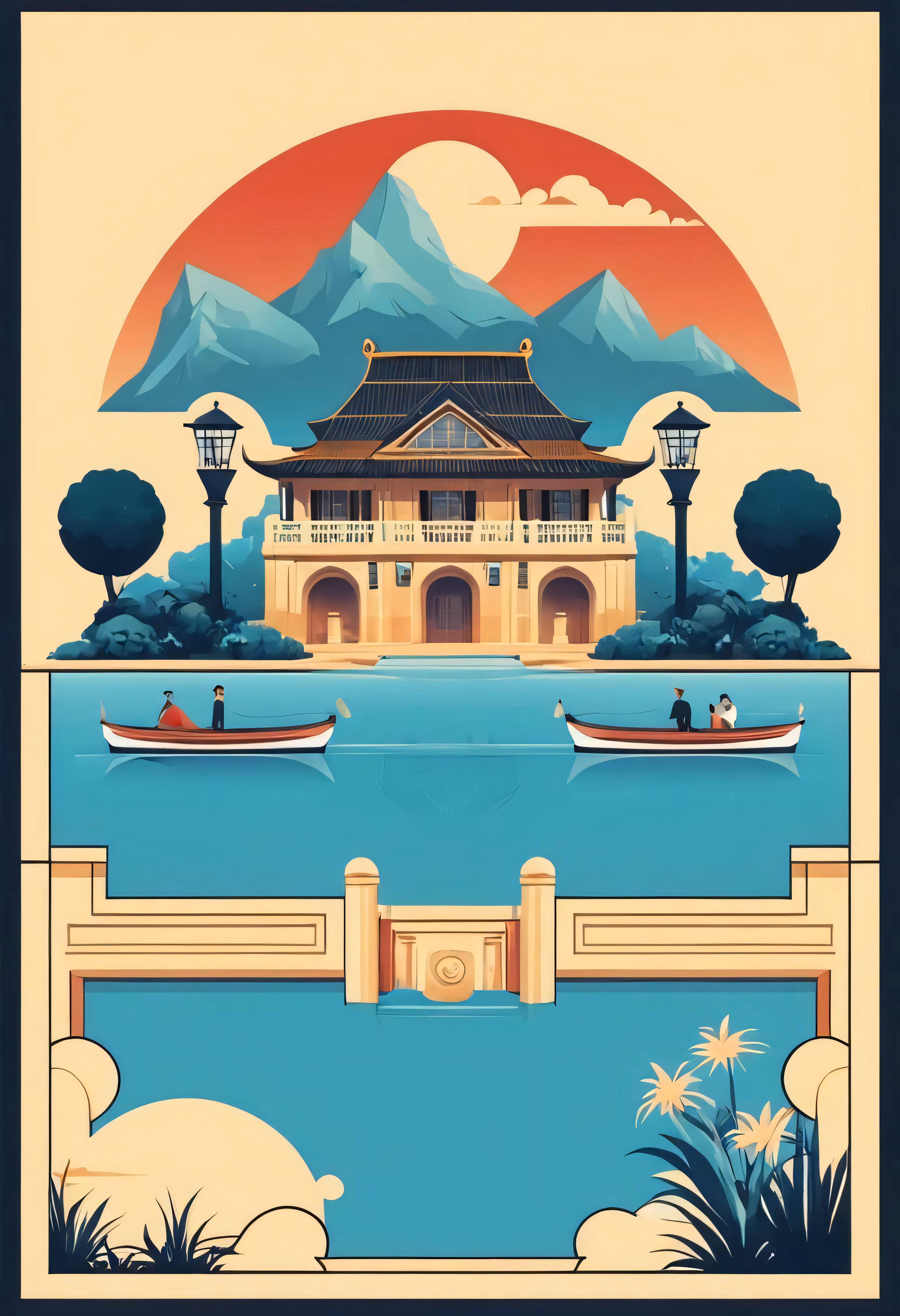 High resolution picture, free to use, a stylized image of a boat on the river with two buildings