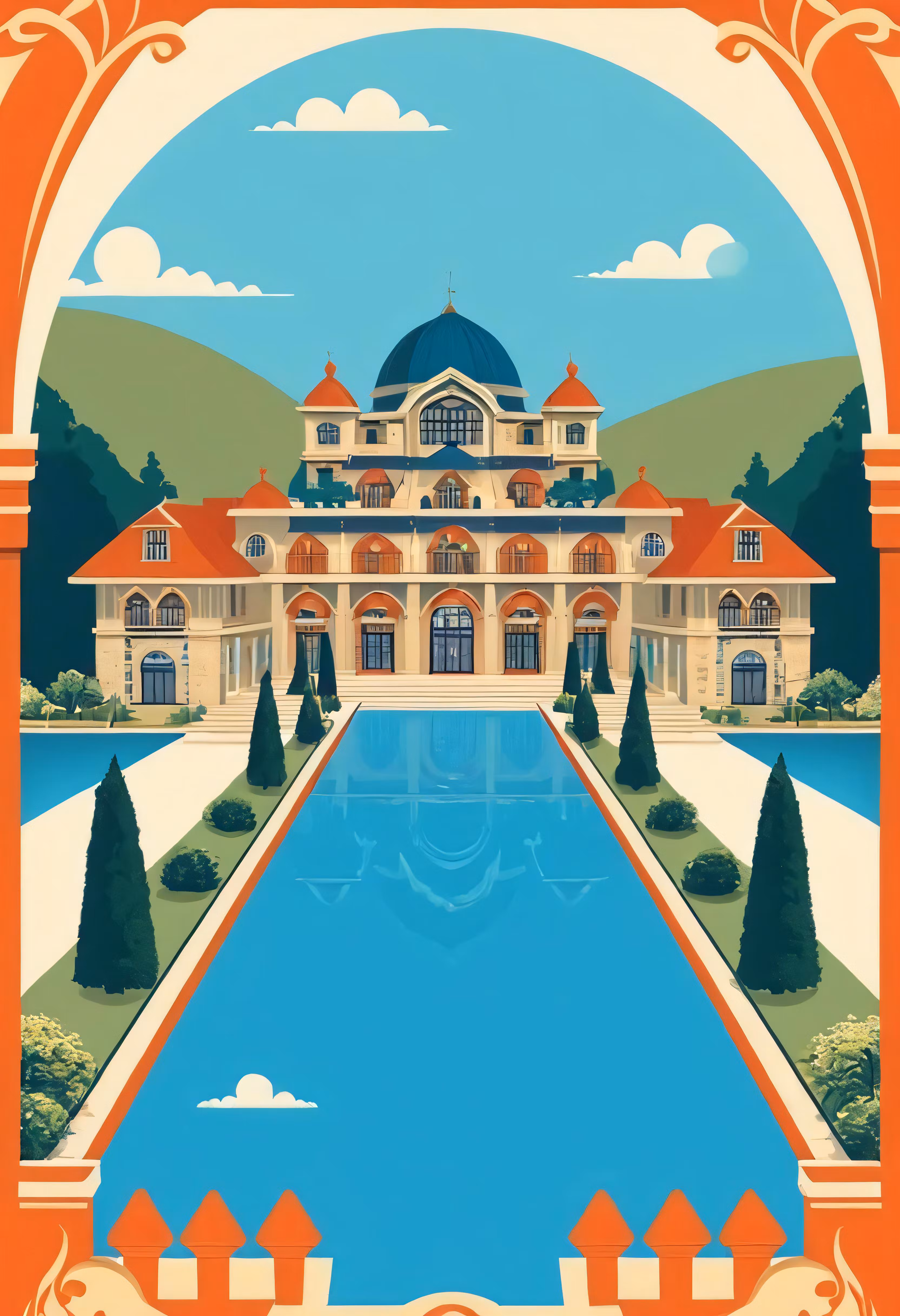 High resolution picture, free to use, a stylized image of the exterior of a palace