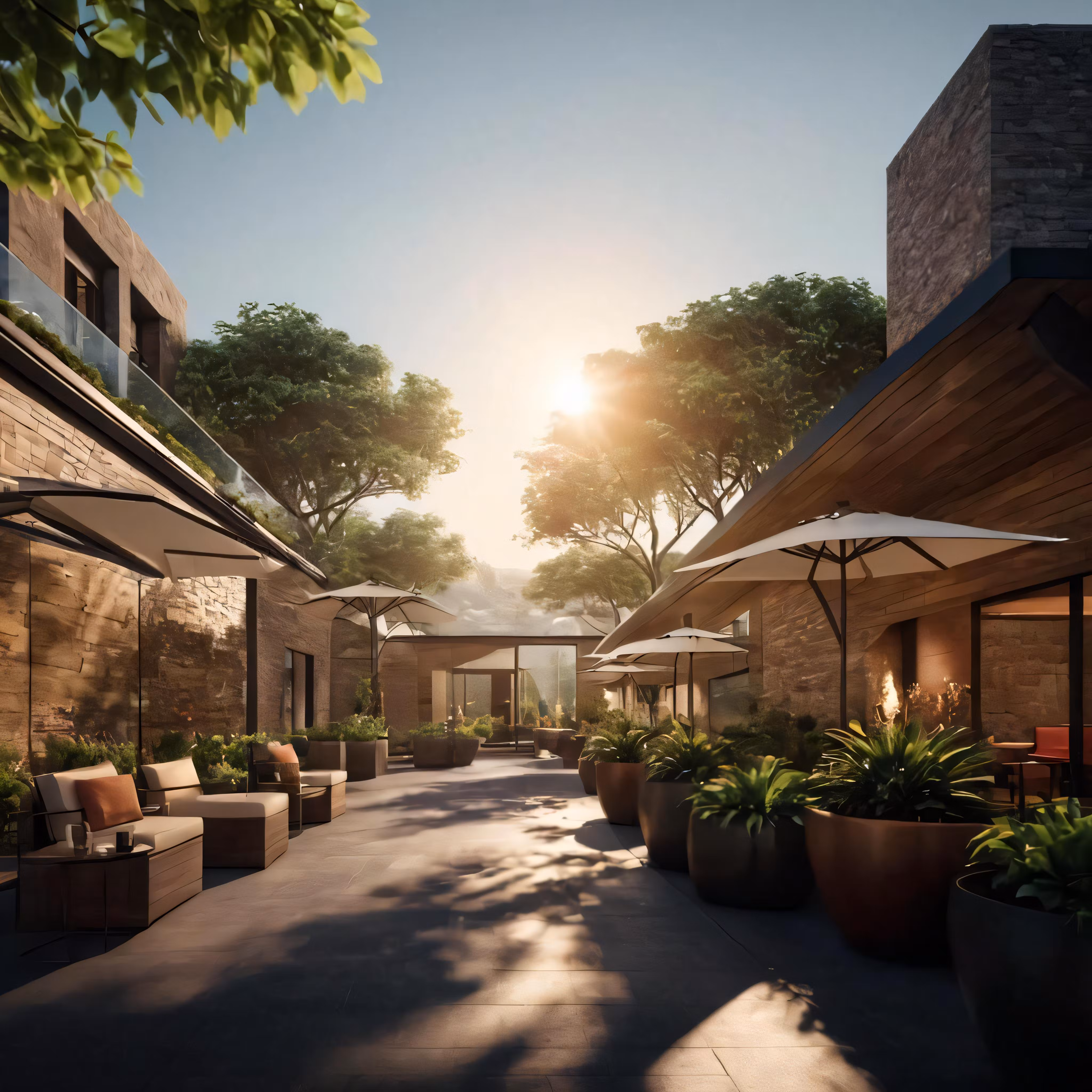 High resolution picture, free to use, a sun is seen shining over the lounges in front of the resort